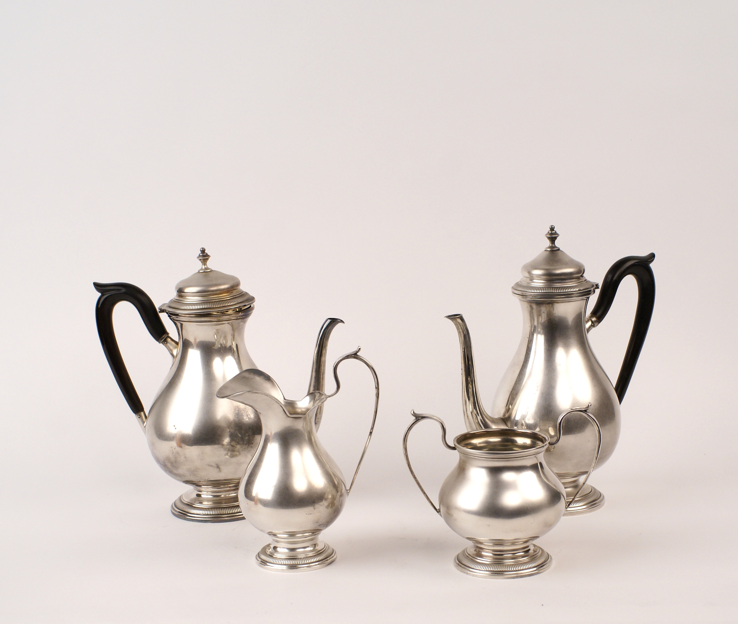 SERVIZIO THE E CAFFE IN ARGENTO manifattura italiana a corpo liscio con manici in legno, composto da una caffettiera, una teira, una lattiera e una zuccheriera 1780 gr.