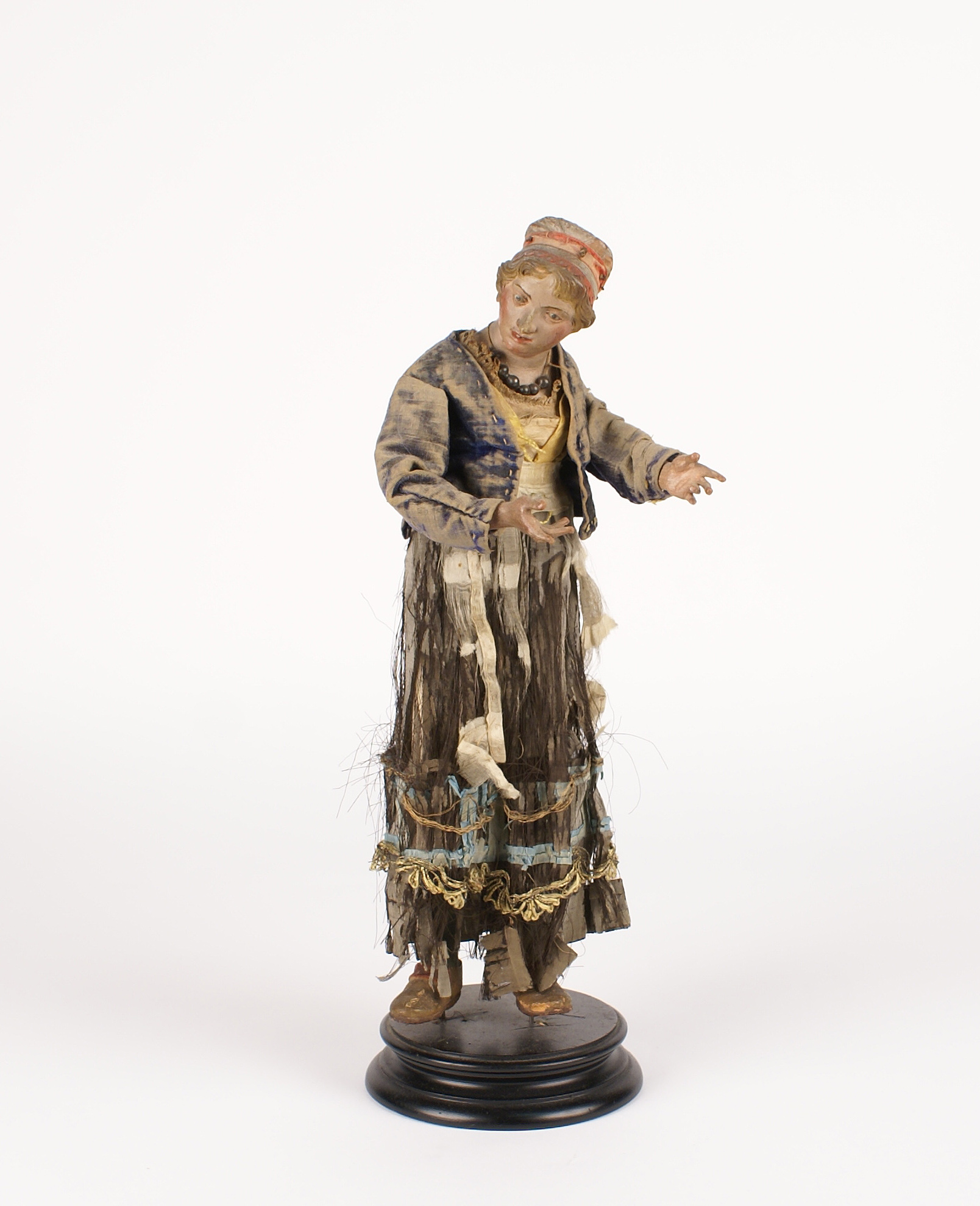 FIGURA DI PRESEPE Napoli XIX secolo raffigurante una popolana realizzata in papier mache, poggiante su base in legno h. 34 cm.