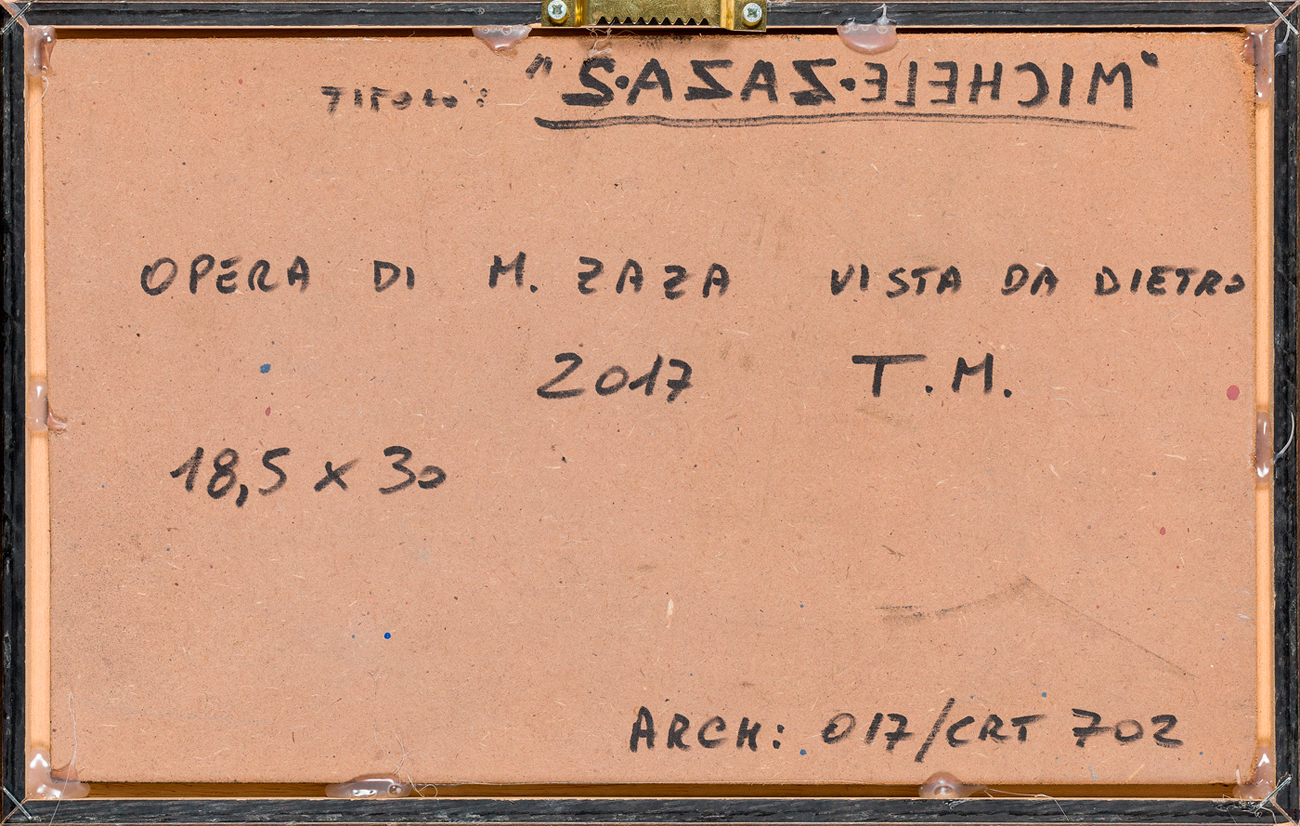 Firma, titolo, datazione, misure e numero di archiviazione al retro del cartoncino protettivo