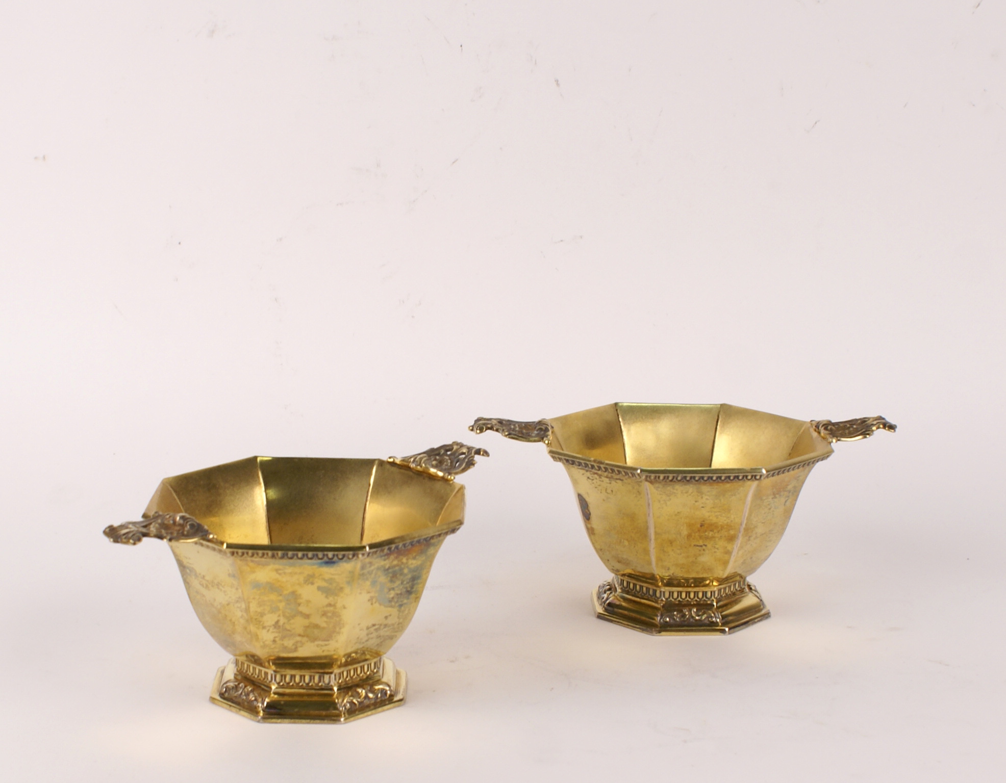 COPPIA DI ZUCCHERIERE IN VERMEIL manifattura italiana di forma ottagonale con prese a motivo di volute, h. cm. 7,5 peso 467 gr.