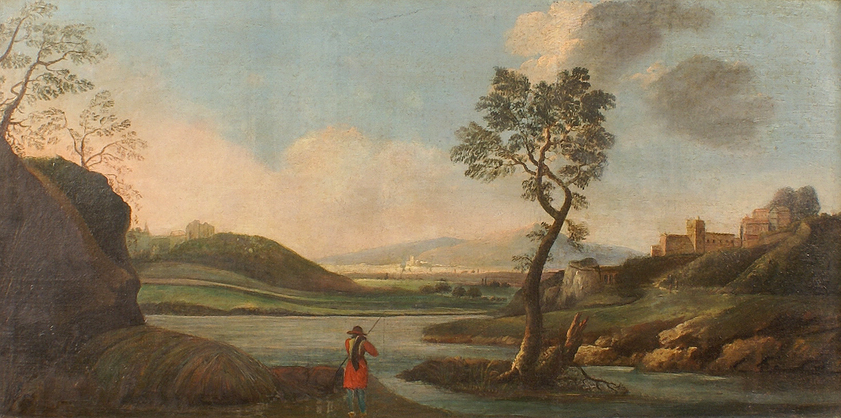 SCUOLA ROMANA XVIII Sec. Paesaggio fluviale con pescatore, olio su tela, entro cornice coeva in legno dorato 42x84,5 cm.