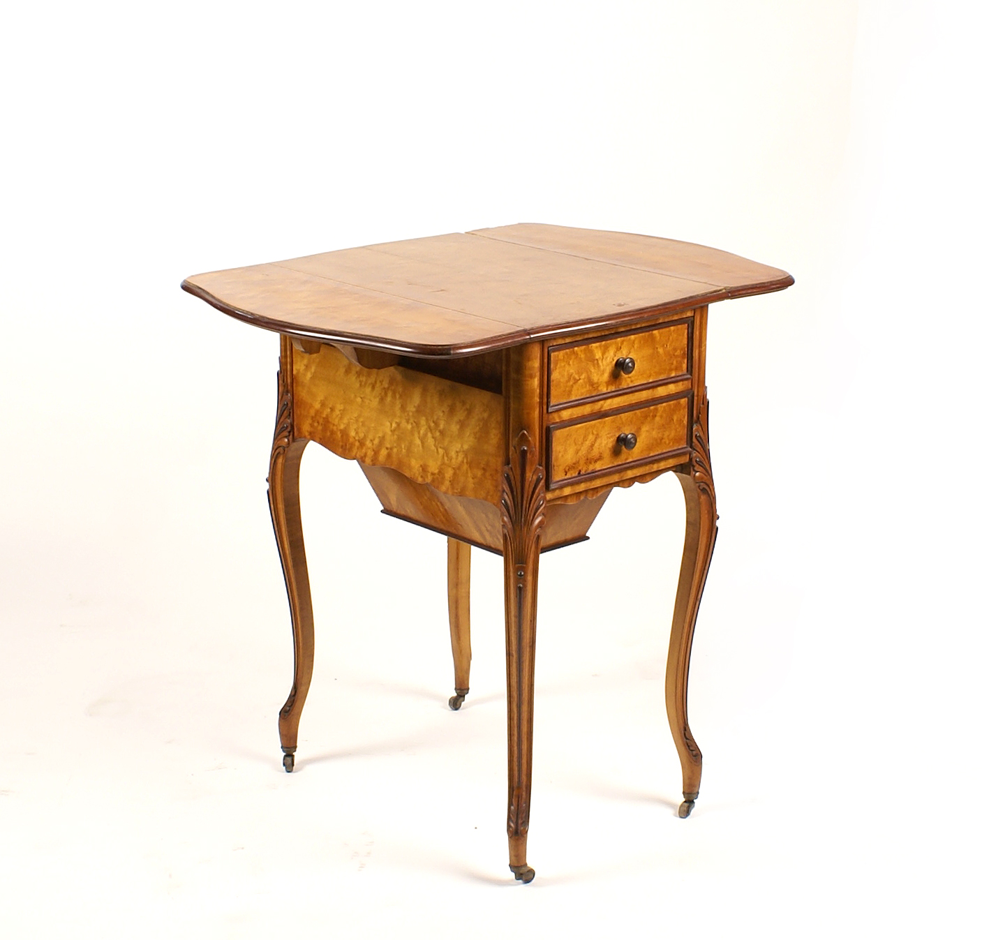 TAVOLINO DA LAVORO IN LEGNO DI ERABLE Francia XIX Sec. piano rettangolare con due alette apribili, fascia sottostante con due tiretti e uno sportello, gambe provviste di rotelle 73x37x55 cm.