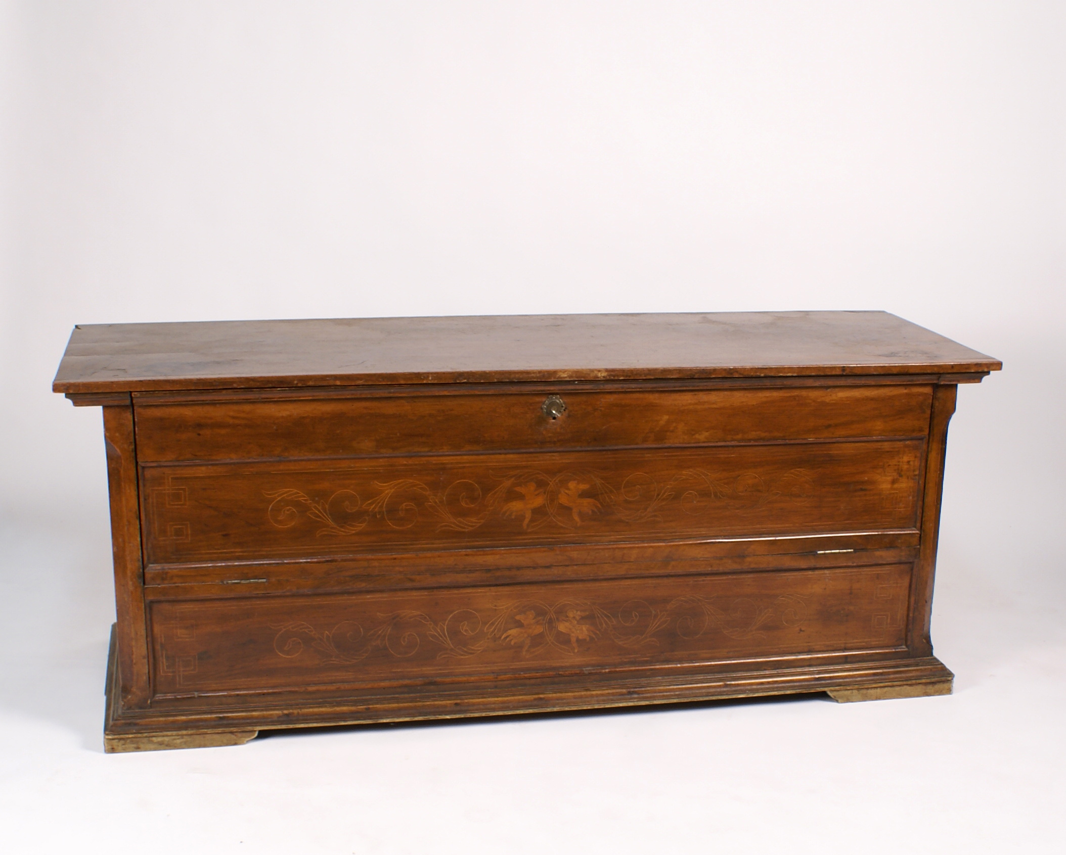 CASSAPANCA NUZIALE IN NOCE vecchia manifattura piano rettangolare con fronte apribile ed intarsiato in legno di bosso 64x163x53 cm.