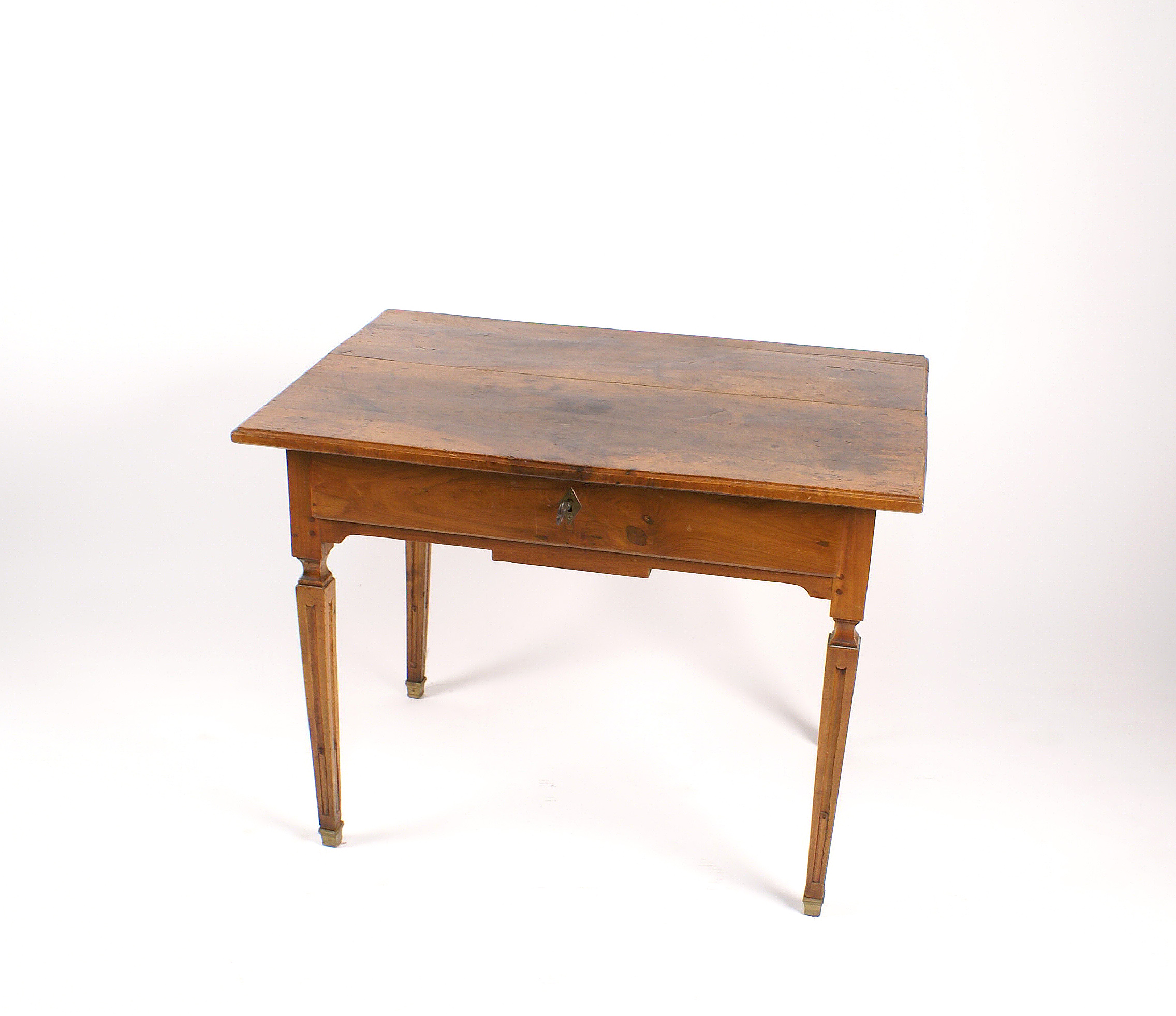 TAVOLINO IN NOCE Italia primi anni del XIX Sec. piano rettangolare con un cassetto sottostante poggiante su quattro sostegni troncopiramidali con terminali in bronzo dorato 67x86x60 cm.