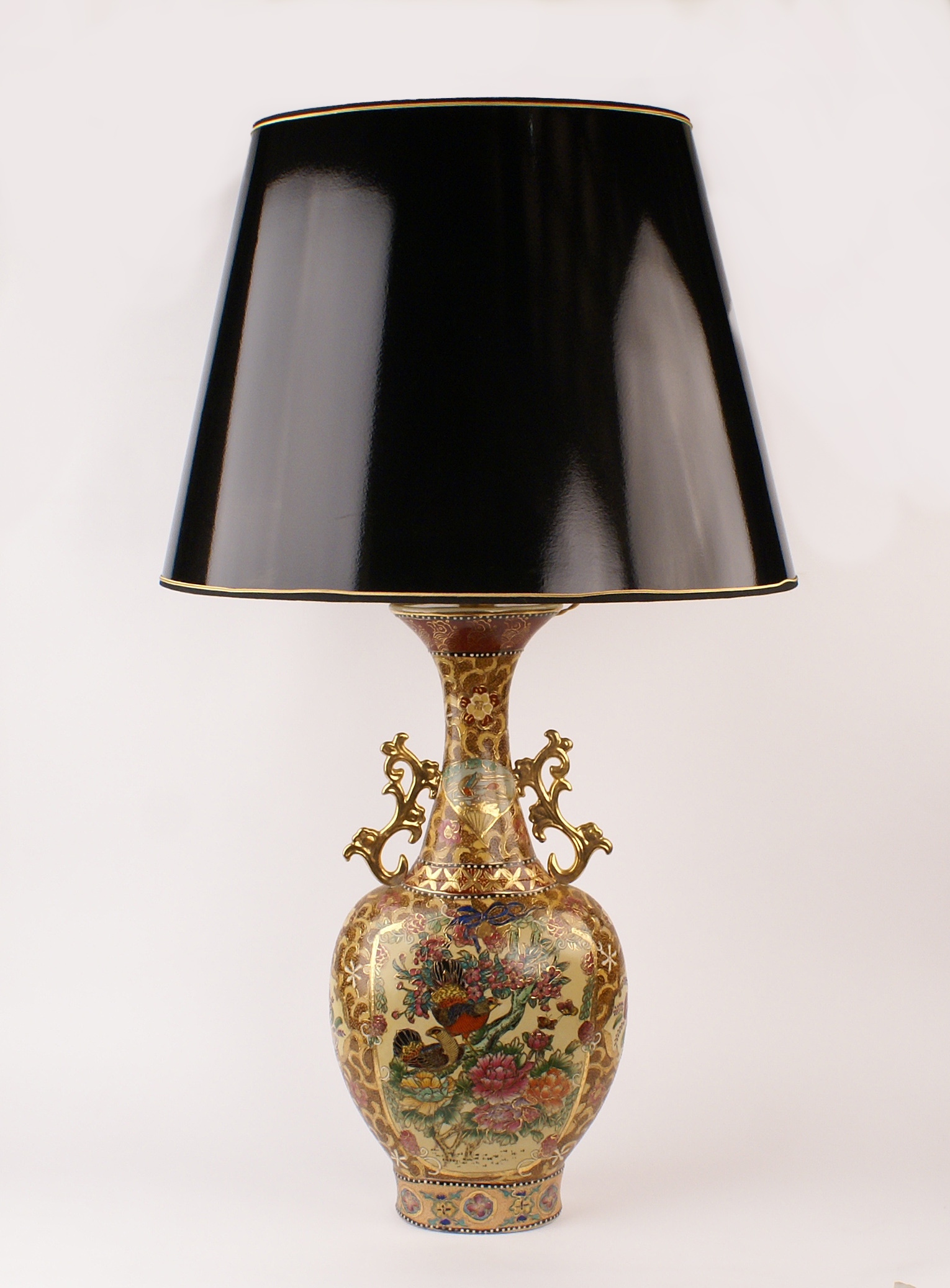LAMPADA IN CERAMICA SMALTATA Cina manifattura recente dipinta in policromia e decorata a motivi di volatili e floreali, completa di paralume 105 cm.