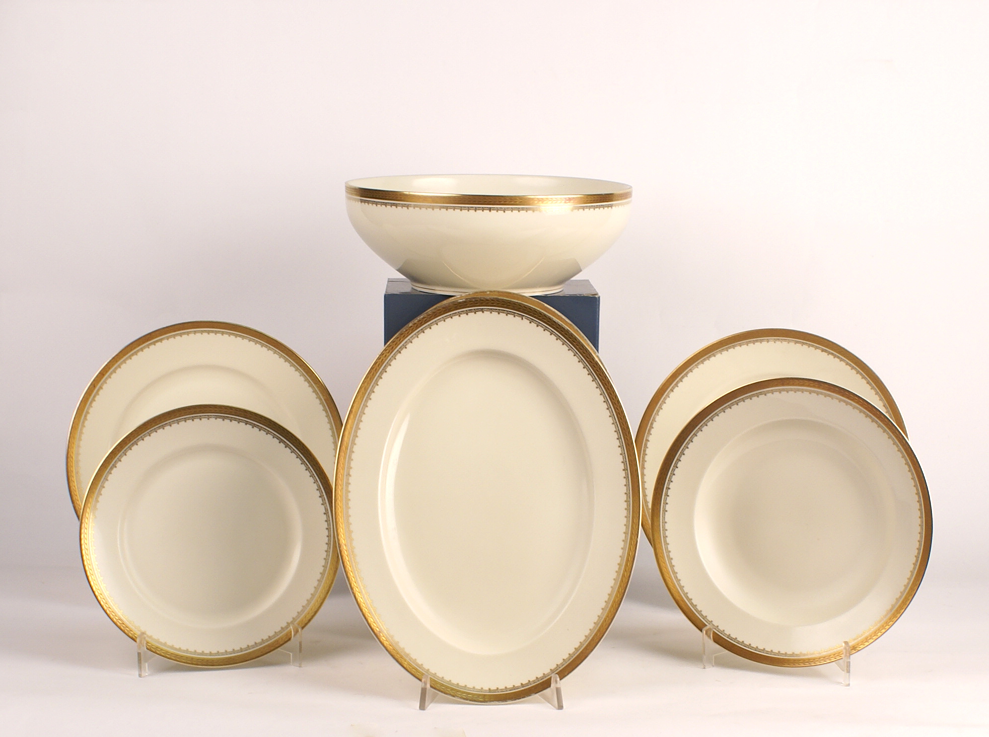 SERVIZIO DI 69 PIATTI manifattura Rosenthal in porcellana avorio con profilo dorato,composto da 36 piatti piani,9 piatti fondi, 12 piattini frutta, 1 insalatiera, 2 piatti ovali da portata e 9 fondi in porcellana Bavaria di foggia diversa ma compatibile