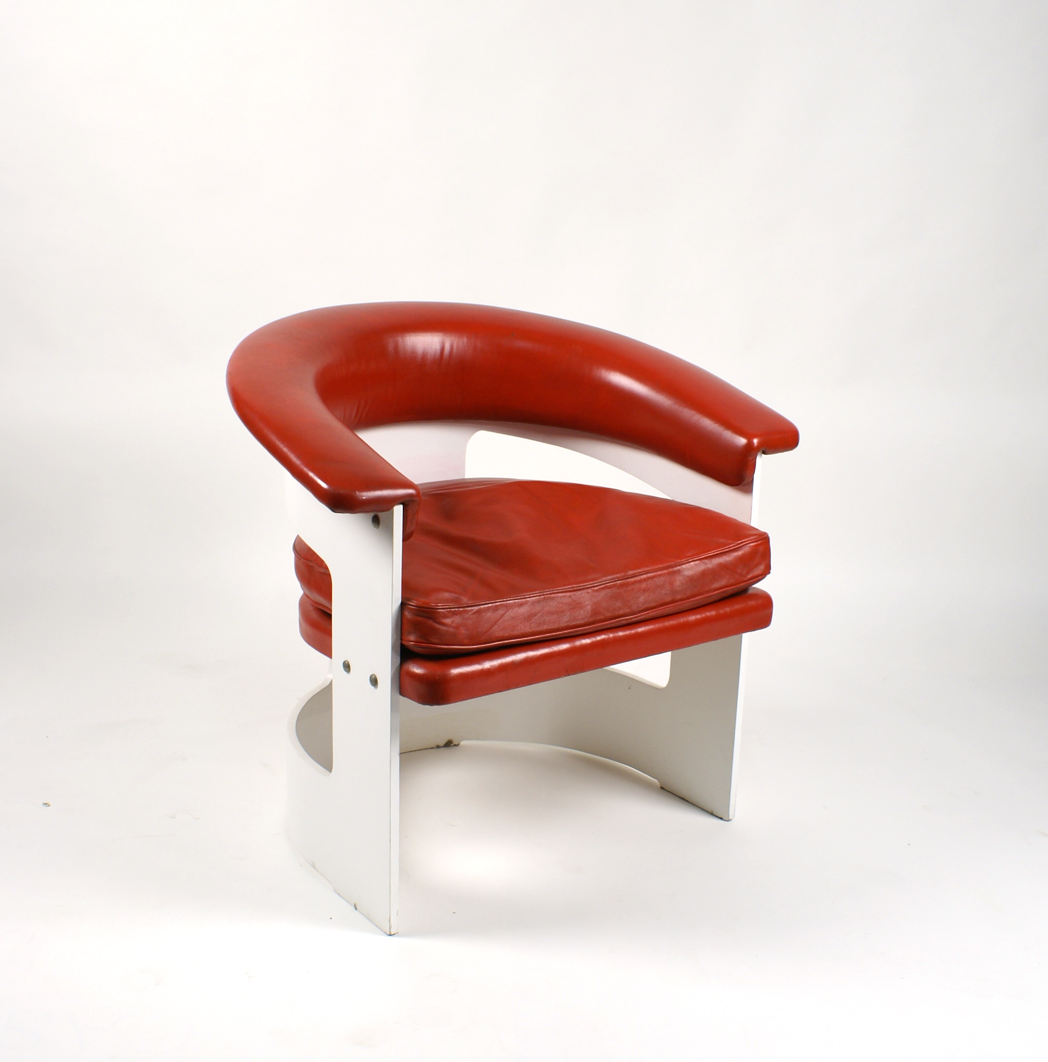 SEDIA JOE COLOMBO VINTAGE in legno laccato bianco con seduta, braccioli e schienale in pelle rossa 74x80x64 cm.