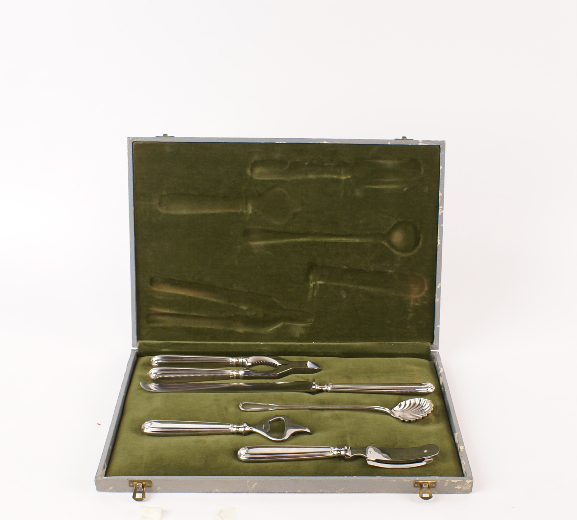 SET DI CINQUE POSATE CON MANICI IN ARGENTO manifattura italiana composto da un apribottiglie, una pinza tappo da champagne, un coltello, un cucchiaio e una posata per scaglie, entro astuccio
