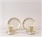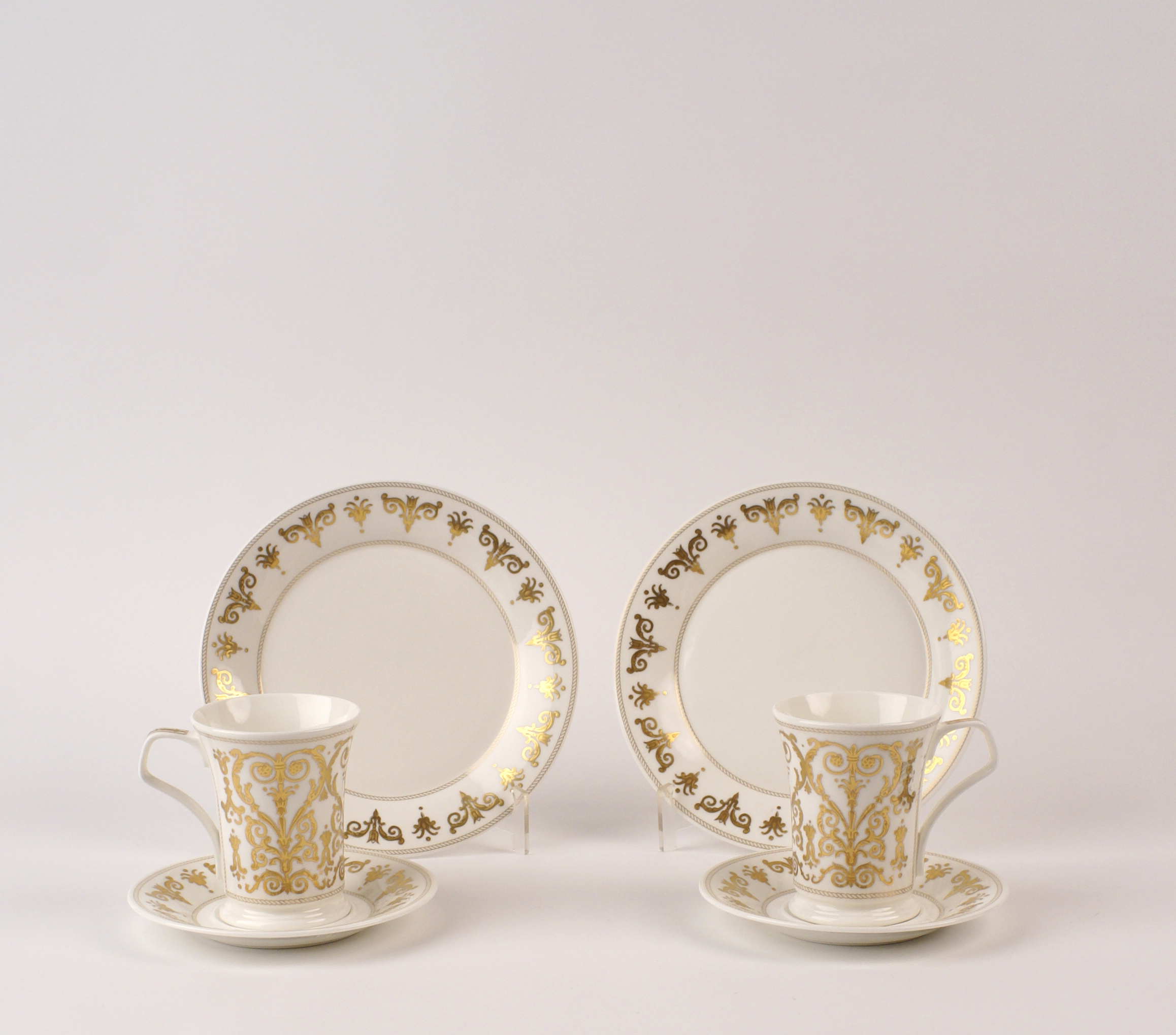 SERVIZIO DA THE TETE A TETE manifattura inglese in porcellana bianca e parzialmente dorata a motivo di volute, composto da due tazze con piattini e due piatti da dolce