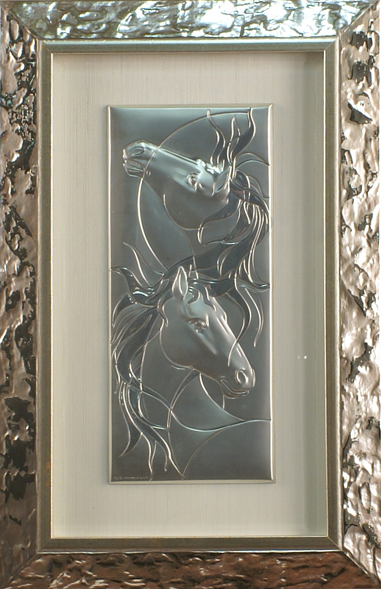 PLACCA IN ARGENTO LAMINATO raffigurante due teste di cavallo entro cornice in legno 54x35 cm.