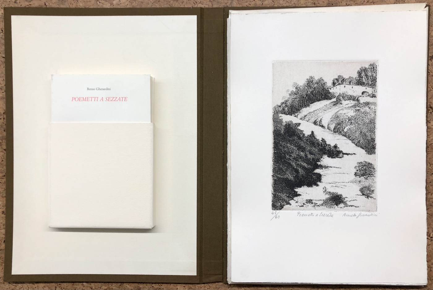 Cartella contenente il libro Poemetti a Sezzate di Renzo Gherardini e 9 incisioni per i Poemetti a Sezzate di Brunetta Gherardini