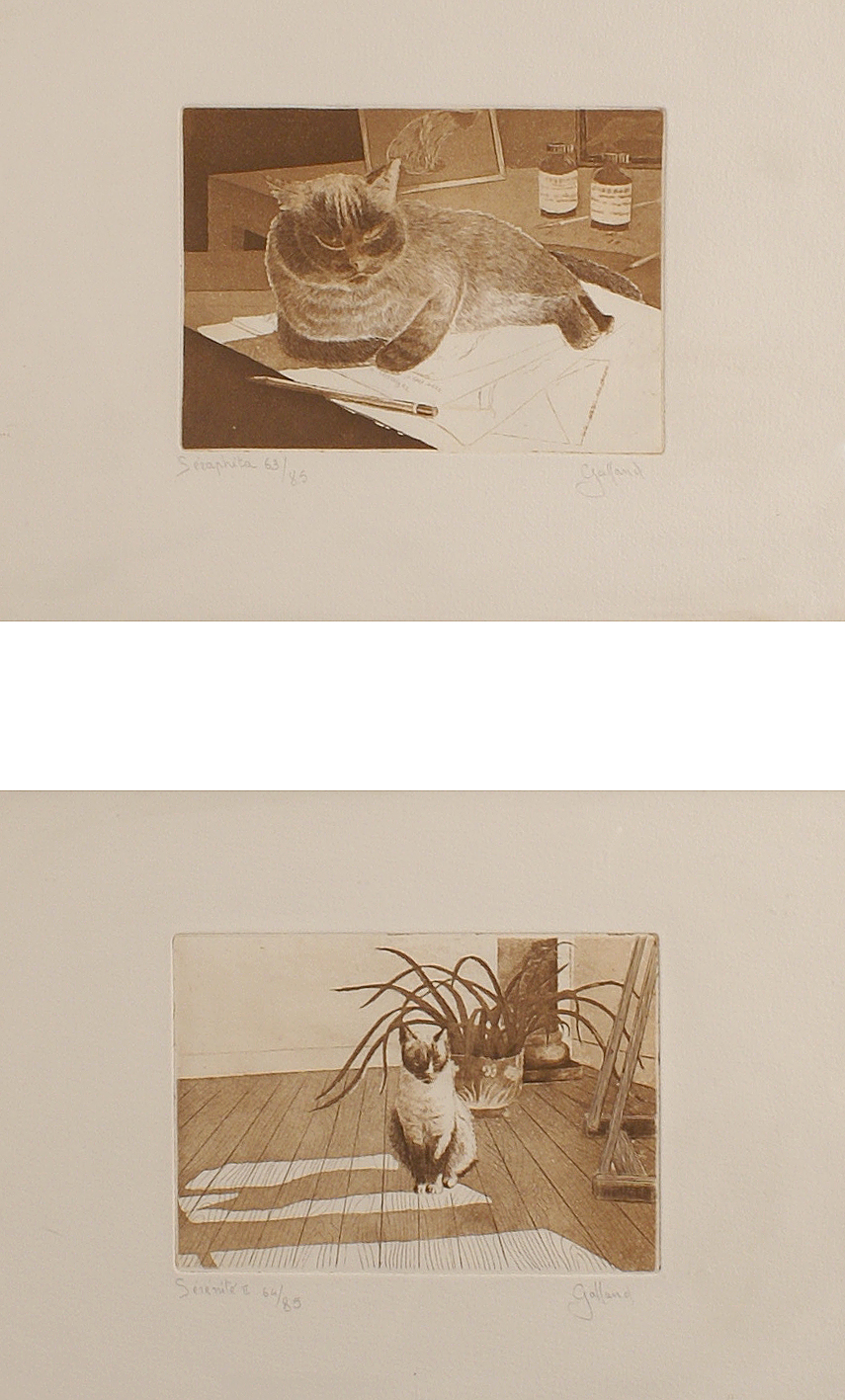 JUDITH GALLAND Francia 1942 coppia di acqueforti colorate a mano, firmate in...