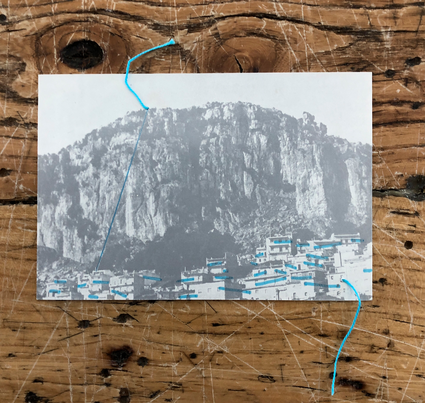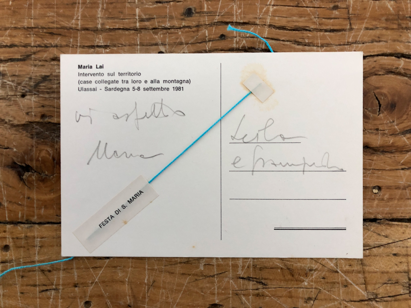 Cartolina con filo di presentazione della performance artistica "Intervento sul territorio (case collegate tra loro e alla montagna) tenutasi presso Ulassai 5-8 Settembre 1981