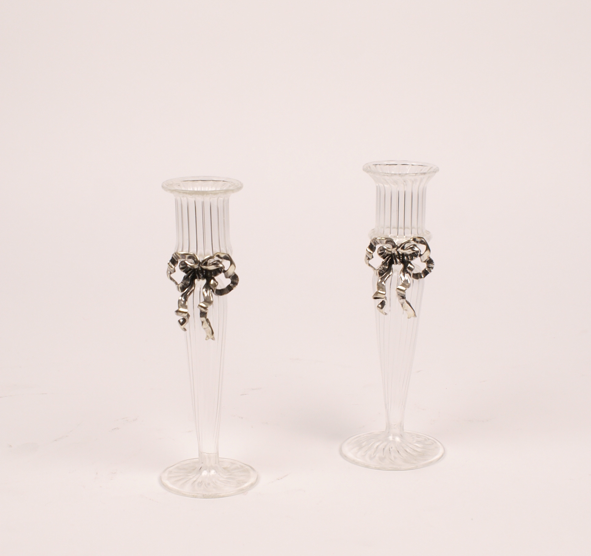 COPPIA DI CANDELIERI IN VETRO CON NODI D'AMORE IN ARGENTO manifattura italiana h. 15,5 cm.