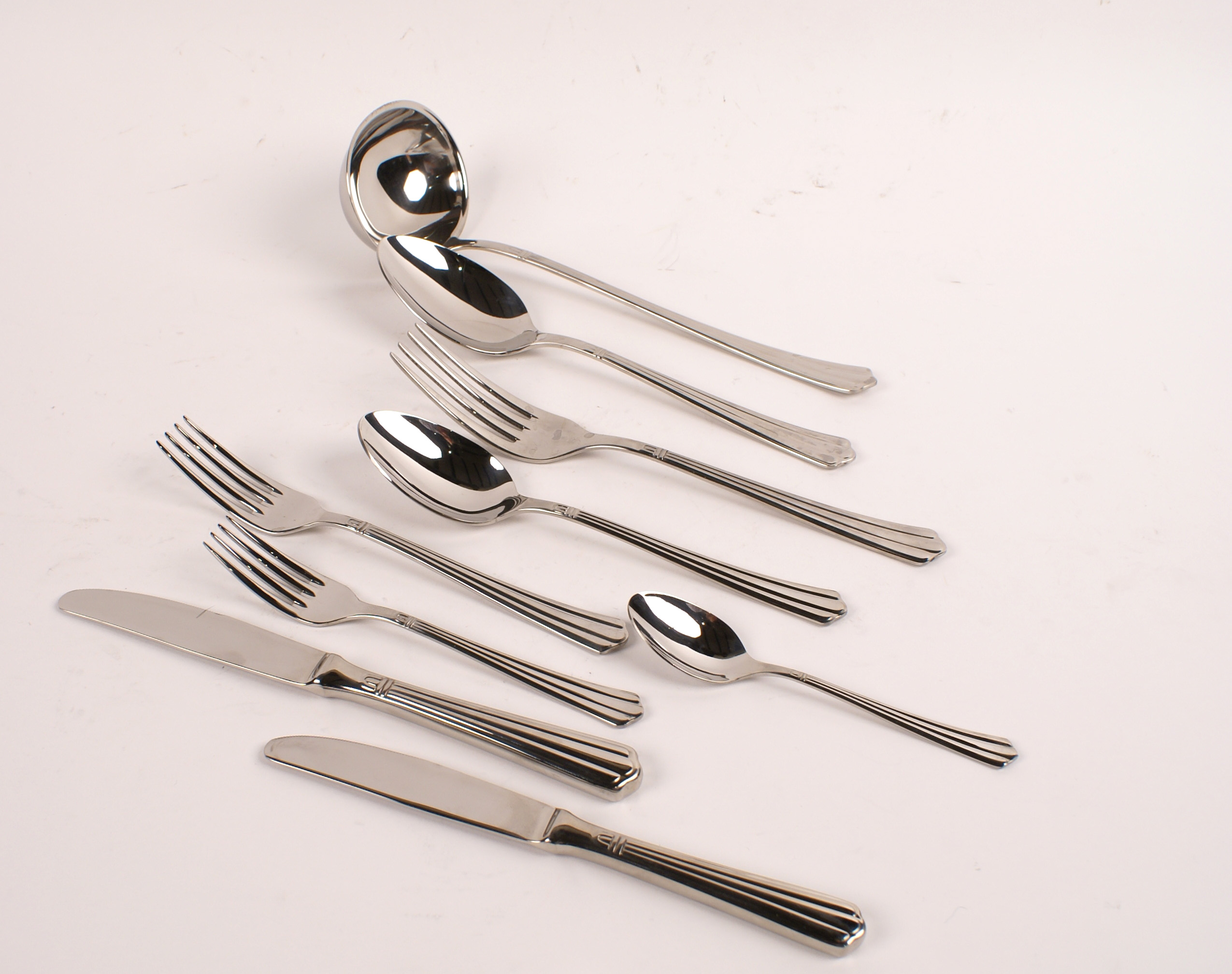 SERVIZIO DI 87 POSATE IN ACCIAIO manifattura recente composto da 23 forchette, 13 coltelli, 12 cucchiai, 12 cucchiaini, 12 forchette frutta, 12 coltelli frutta e 3 posate da portata