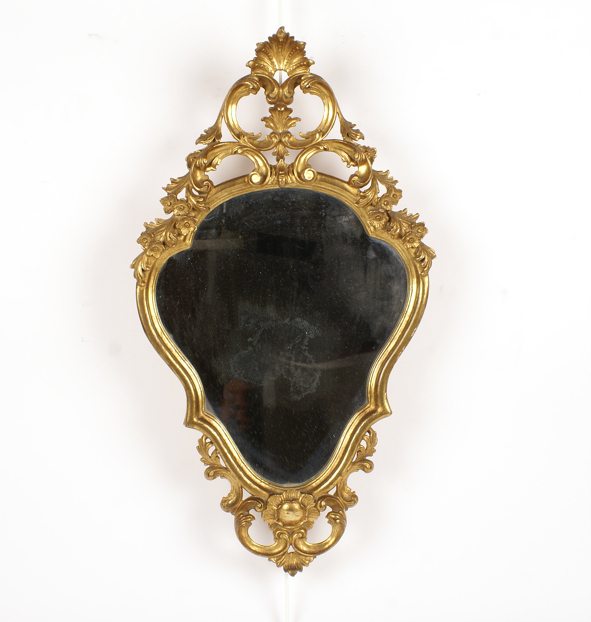 SPECCHIERA DI LINEA MOSSA vecchia manifattura in legno dorato ed intagliato a motivo floreale e di volute cm. 64x36