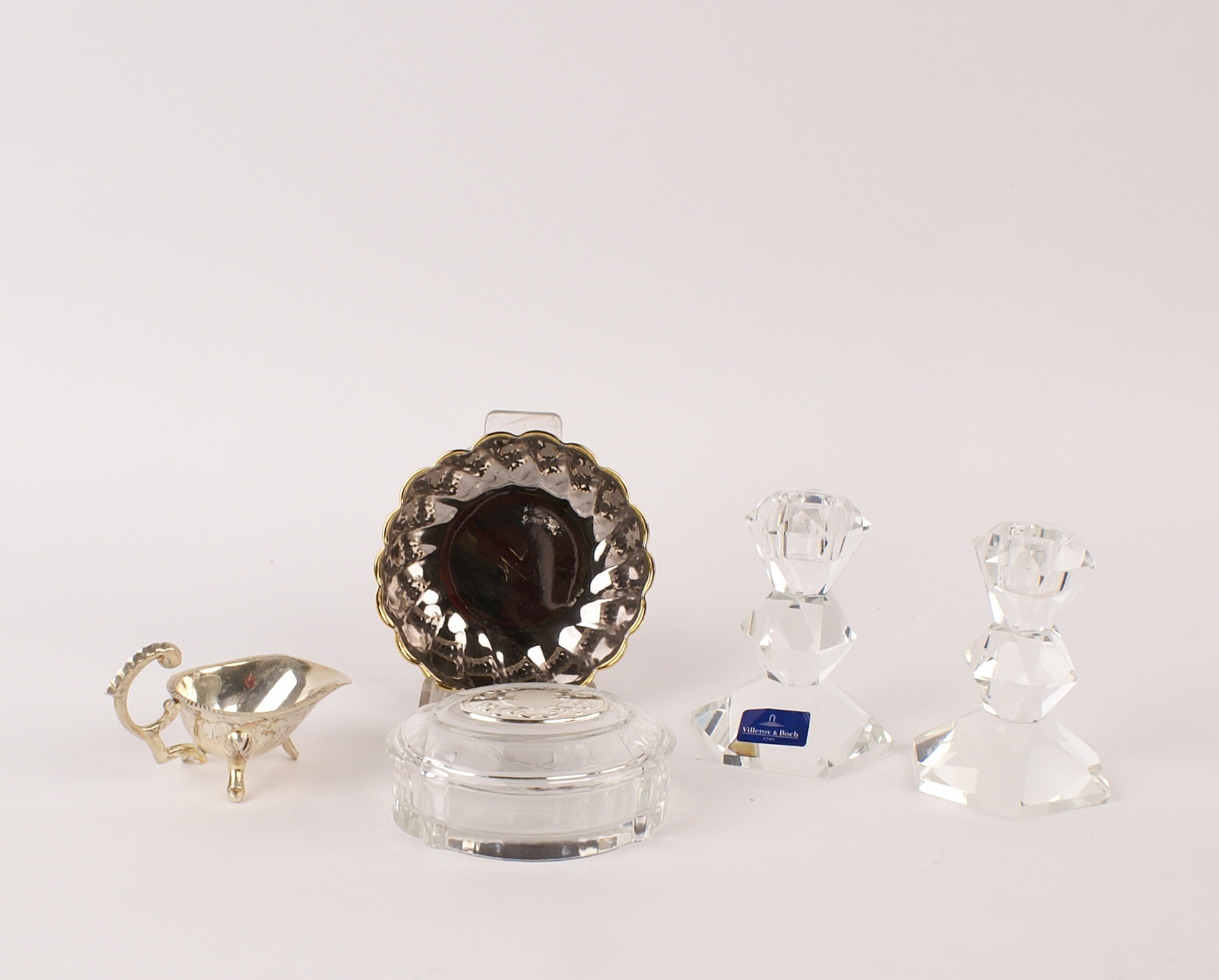 LOTTO DI 5 OGGETTI composto da due candelieri e una scatola in cristallo e da due oggetti in metallo argentato