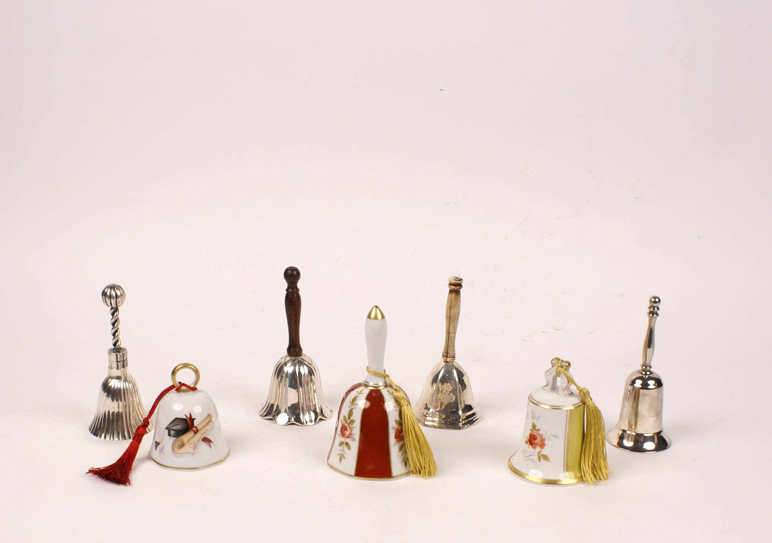 SETTE CAMPANELLI IN METALLO E PORCELLANA POLICROMA fogge, misure e...