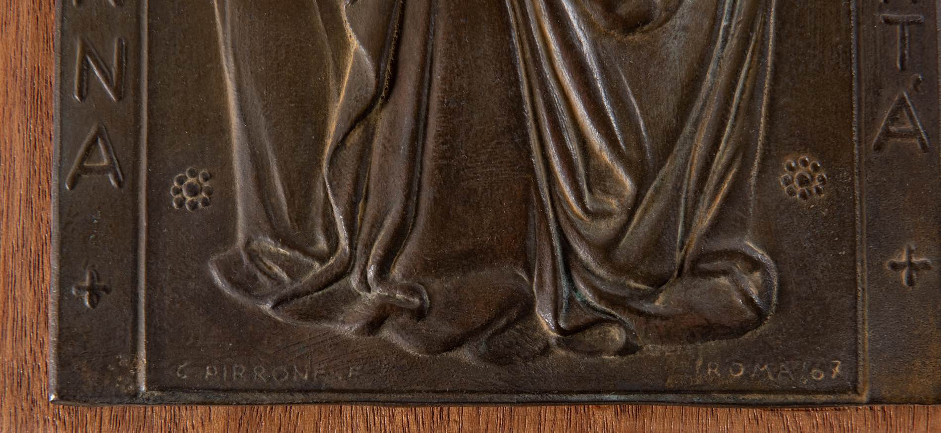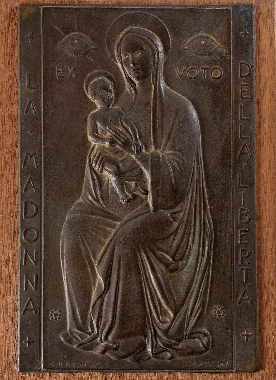 Giuseppe Fortunato Pirrone (Borghetto 1898 - Roma 1978), “Madonna della Libertà”, 1967. - Bassorilievo in bronzo montato su lastra di legno, firmato in basso a sinistra G Pirrone, datato in basso a destra Roma 67, Lastra H cm 25x16.5