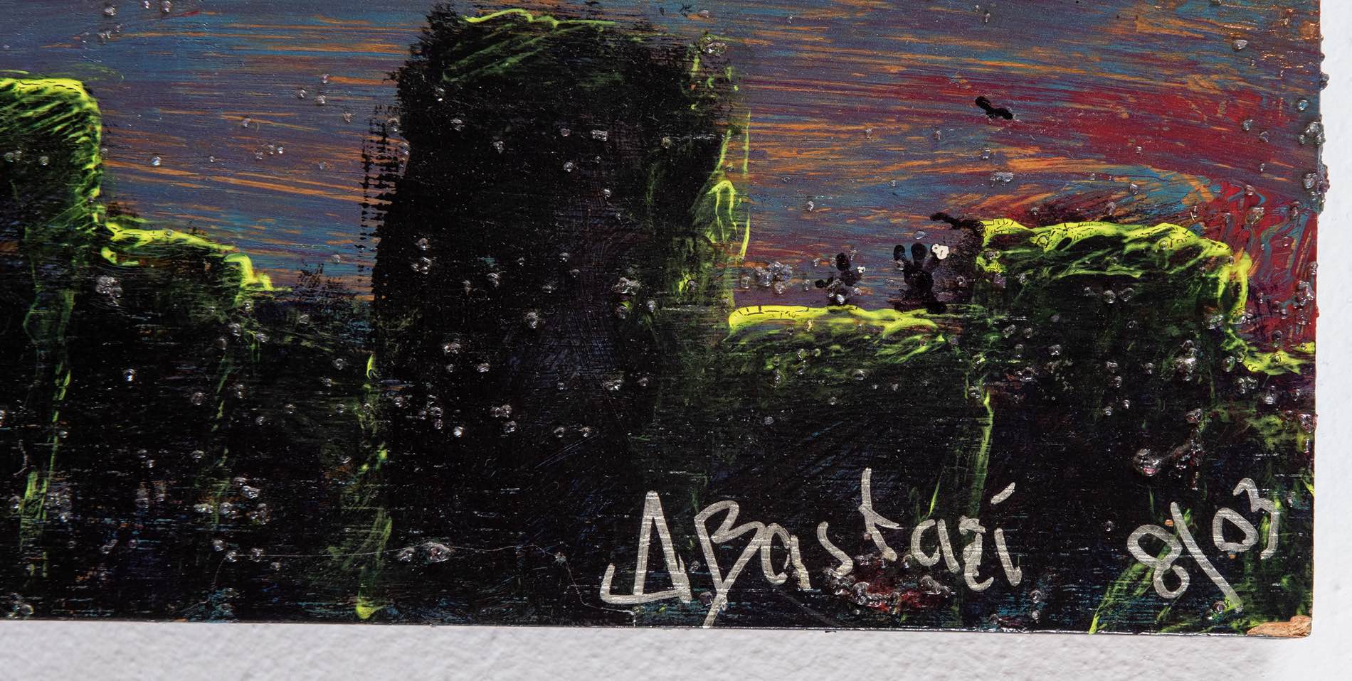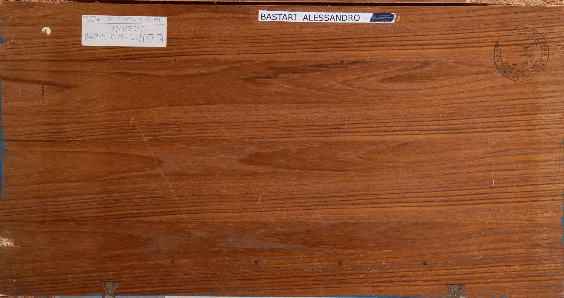 Alessandro "Bax" Bastari (Bologna 1974), “Il lupo della steppa urbana”, 2003. - Tecnica mista su tavola, firmato e datato in basso a destra A Bastari 8/03, al retro etichetta con titolo e nome, timbro di esposizione al retro, H cm 36x67