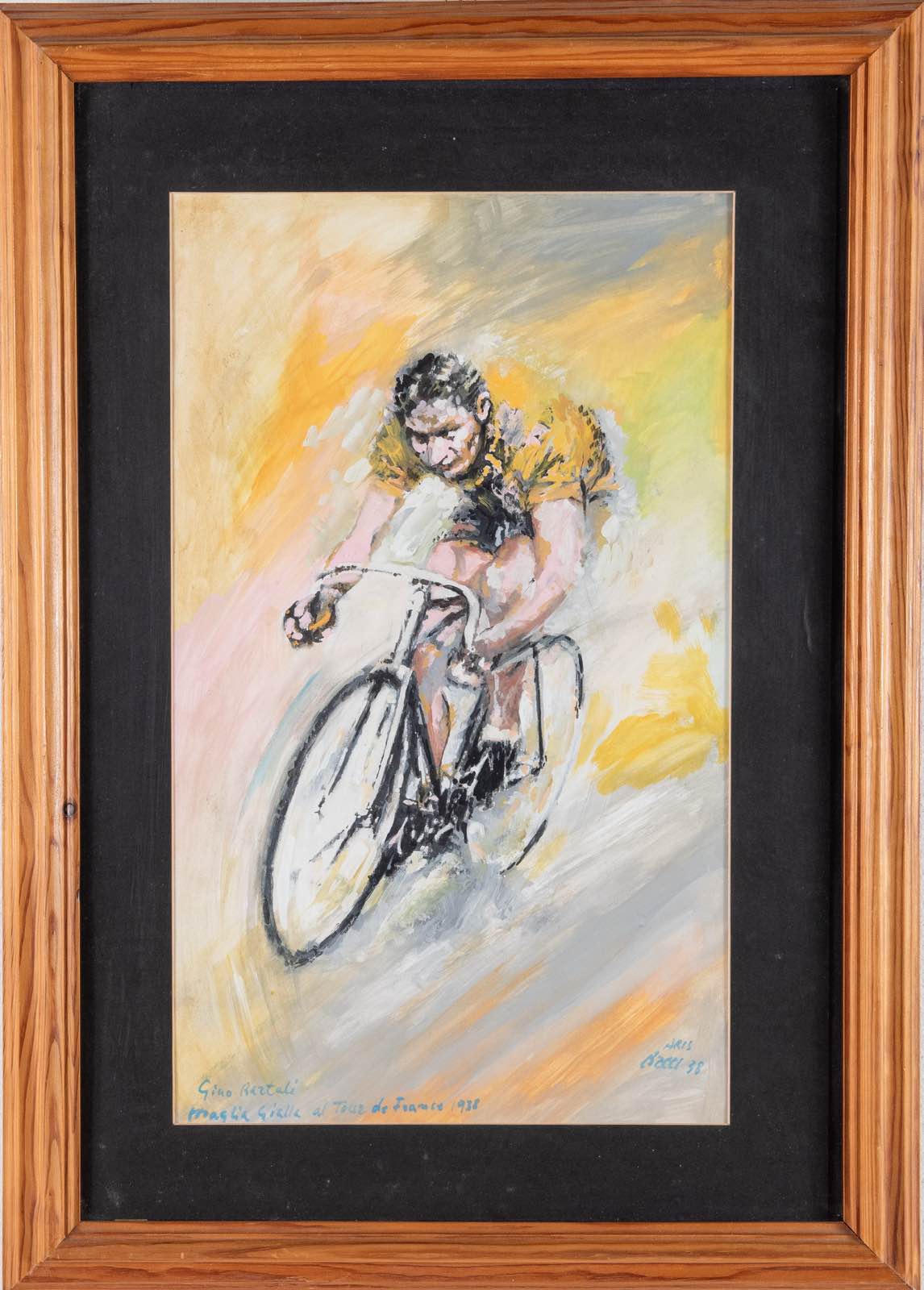 Aris Bacci (Bologna 1894 - New York 1948), “Gino Bartali”, 1938. - Tempera su carta, firmato e datato in basso a destra Aris Bacci 38, titolato in basso a sinistra ‘Gino Bartali/Maglia Gialla al Tour de France 1938’, H cm 60x40