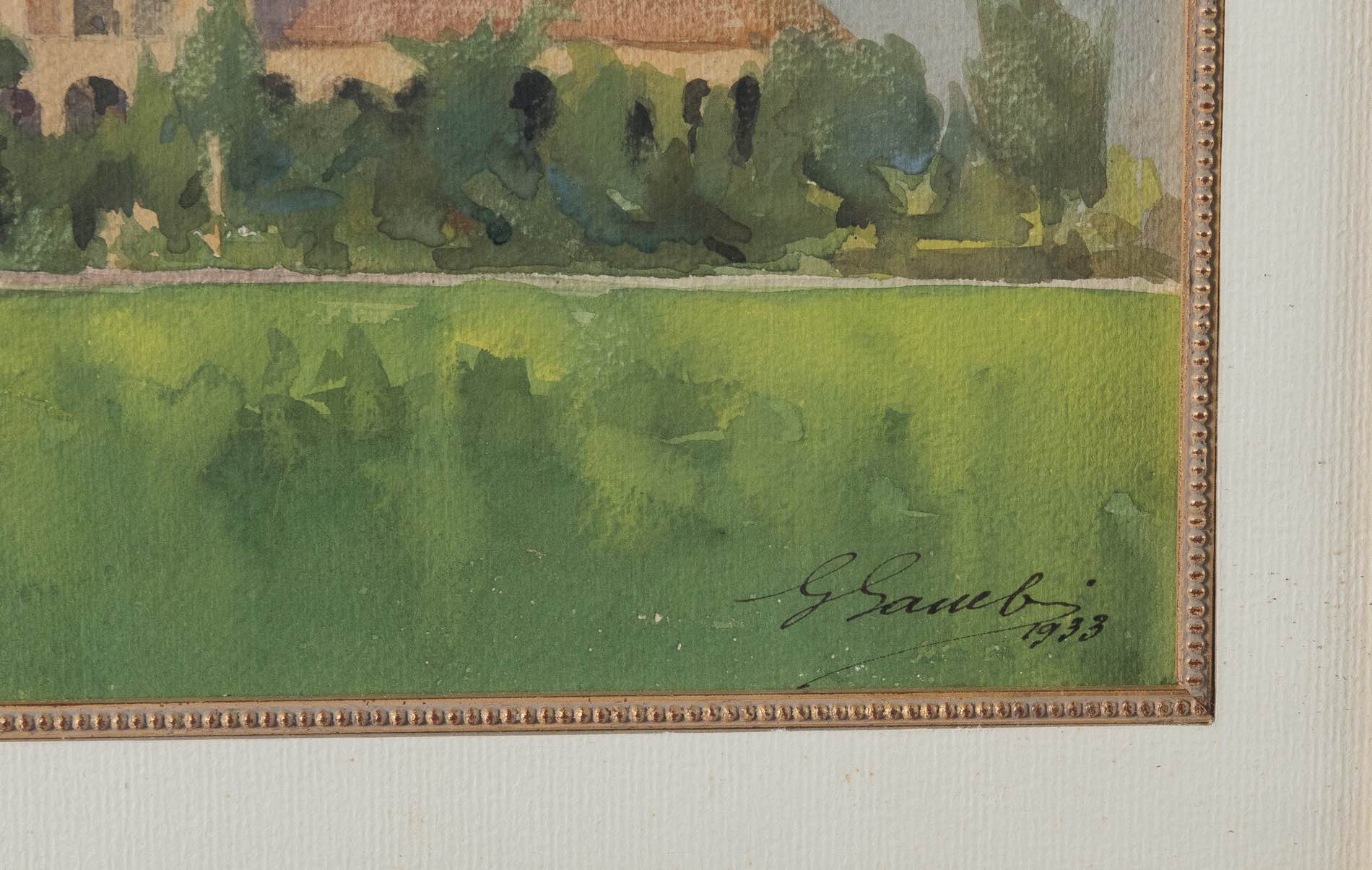 Gaspare Gambi (Ravenna 1889 - 1968), “Basilica di Sant’Apollinare in Classe a Ravenna”, 1933. - Acquerello su carta, firmato e datato in basso a destra G. Gambi 1933, H cm 33x44