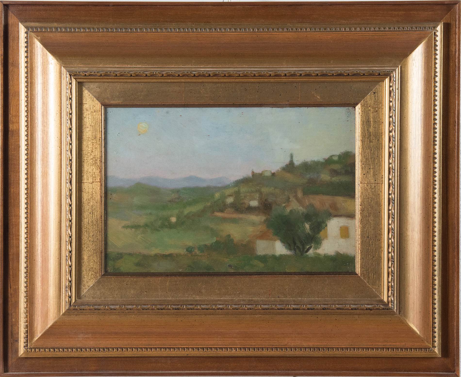 Pittore del XX secolo, “Paesaggio collinare”. - Olio su tavola, reca etichetta al retro, H cm 22.5x34