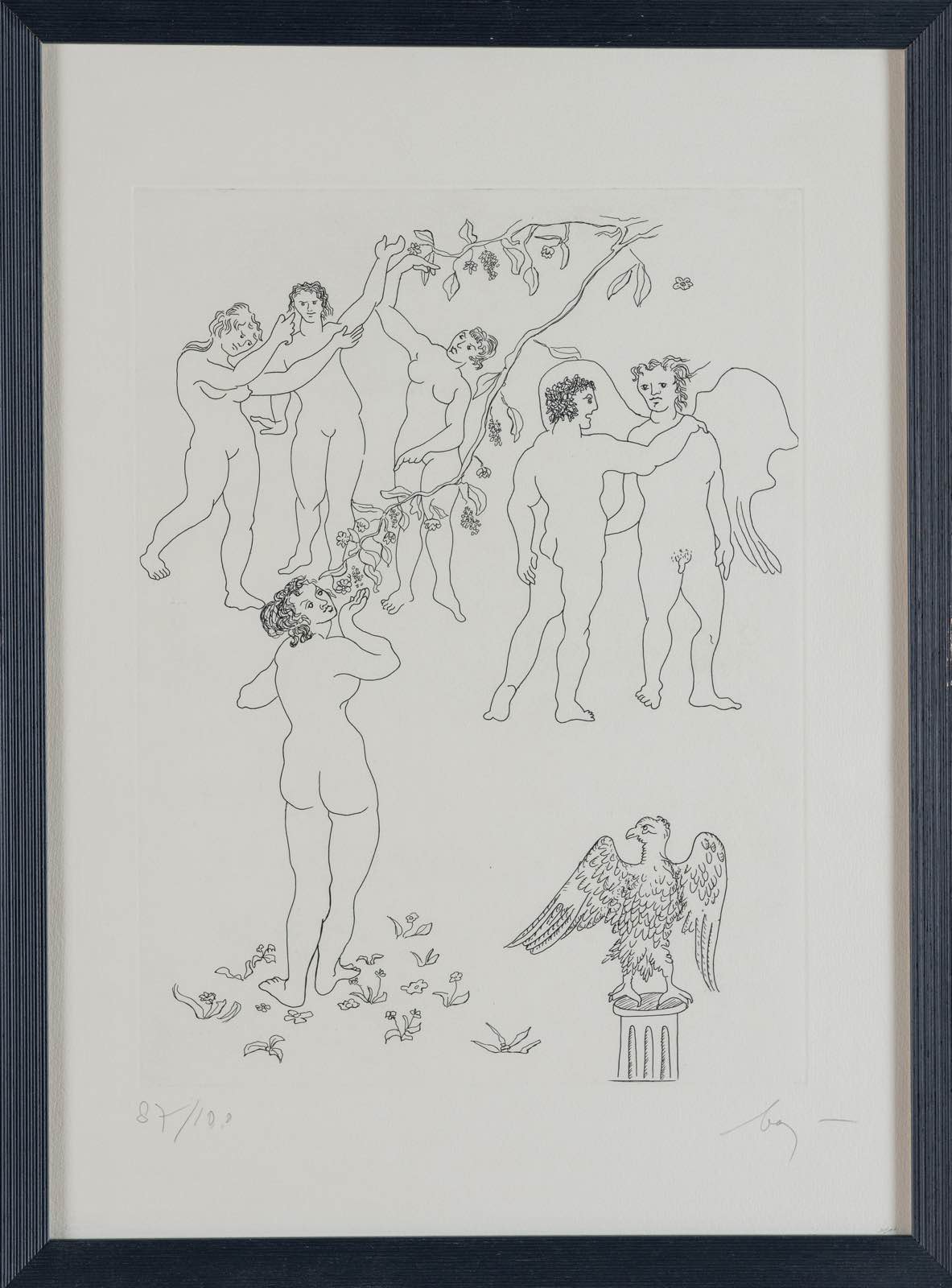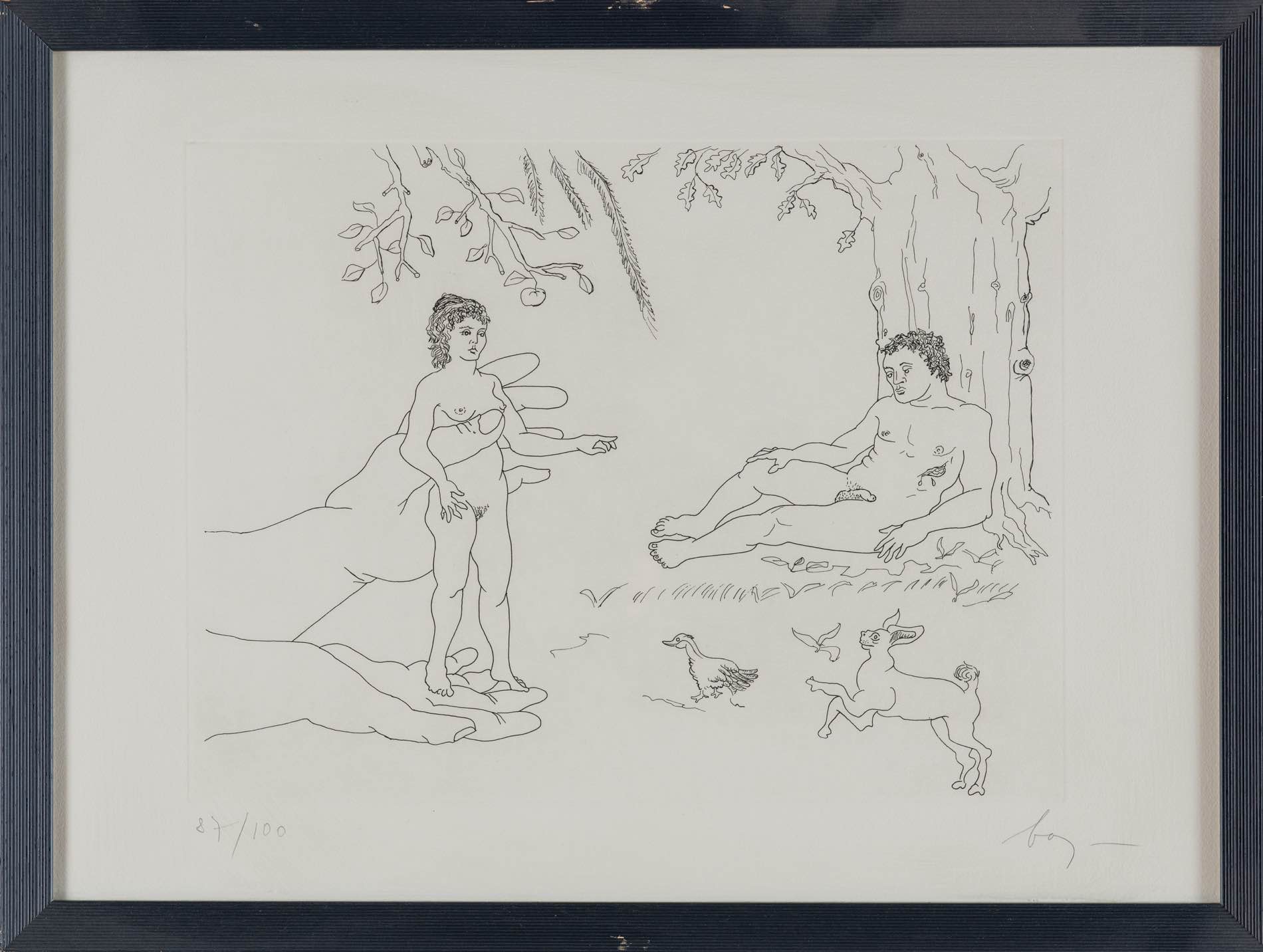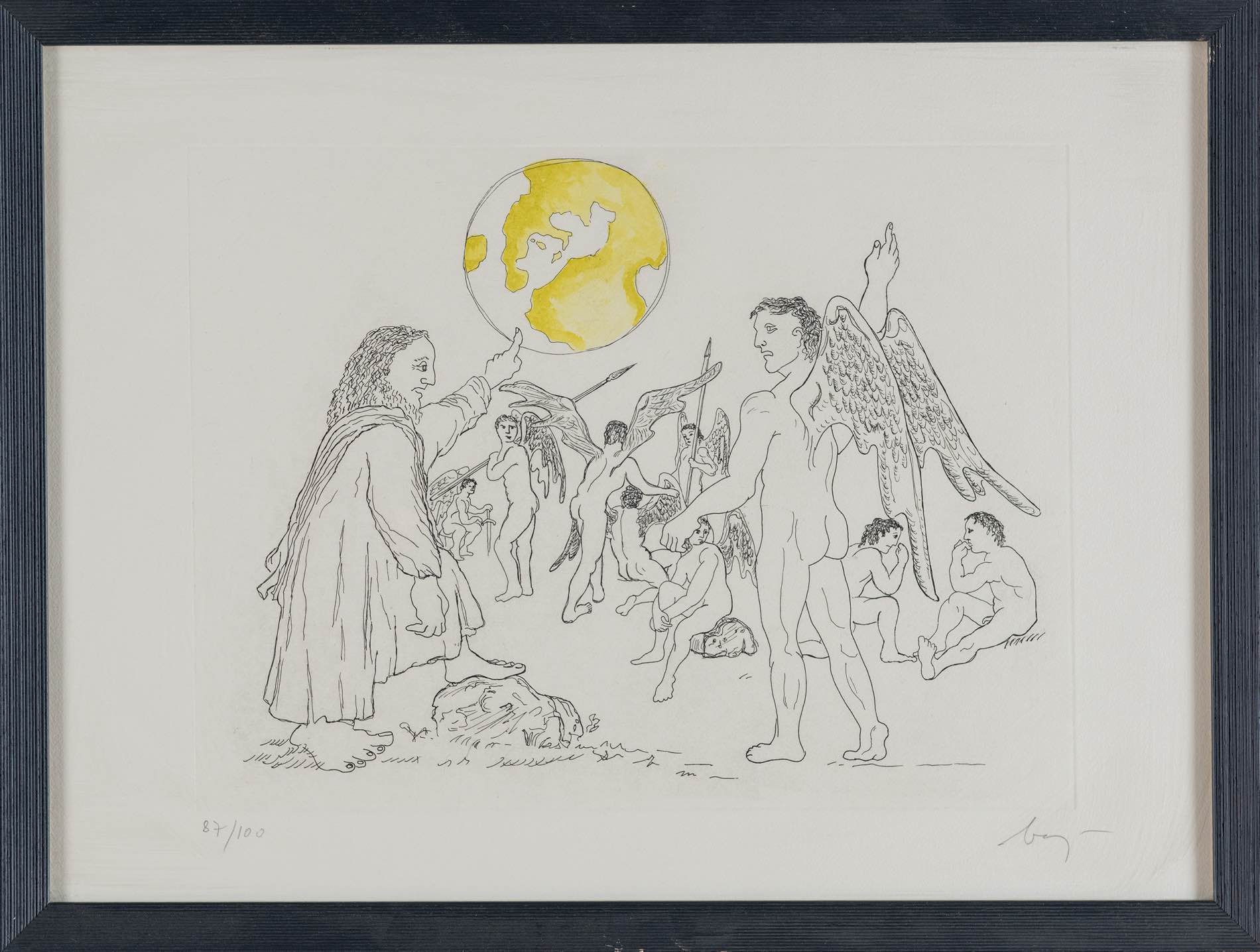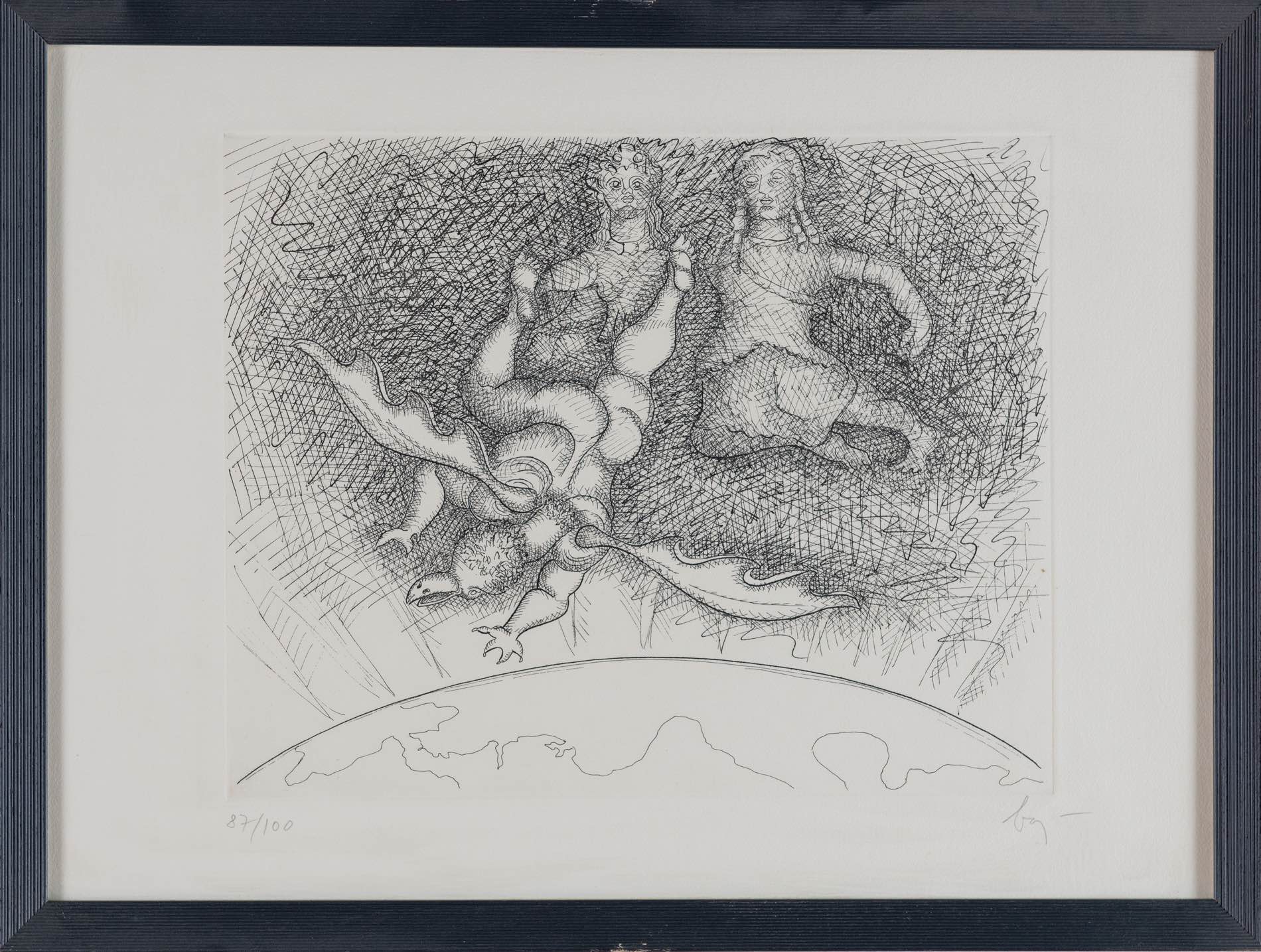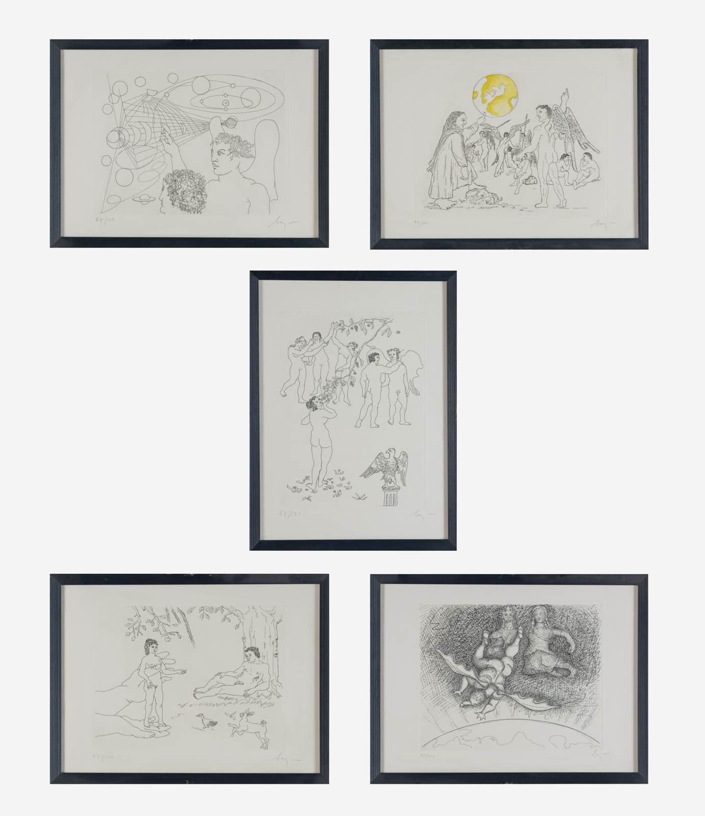 Enrico Baj (Milano 1924 - Vergiate 2003), “Il paradiso perduto”. - Lotto composto da 5 acqueforti su carta della serie ‘Il paradiso perduto’, firmate in basso a destra Baj, numero di tiratura in basso a sinistra 87/100, Foglio H cm 38x52 - Lastra cm 29x38 Al retro iscrizione con titolo e timbro Galleria d’Arte Martina - Bologna. Bibliografia di riferimento: Mastrogiacomo Images 70 - Galleria Casa Editrice - Padova - Italy.