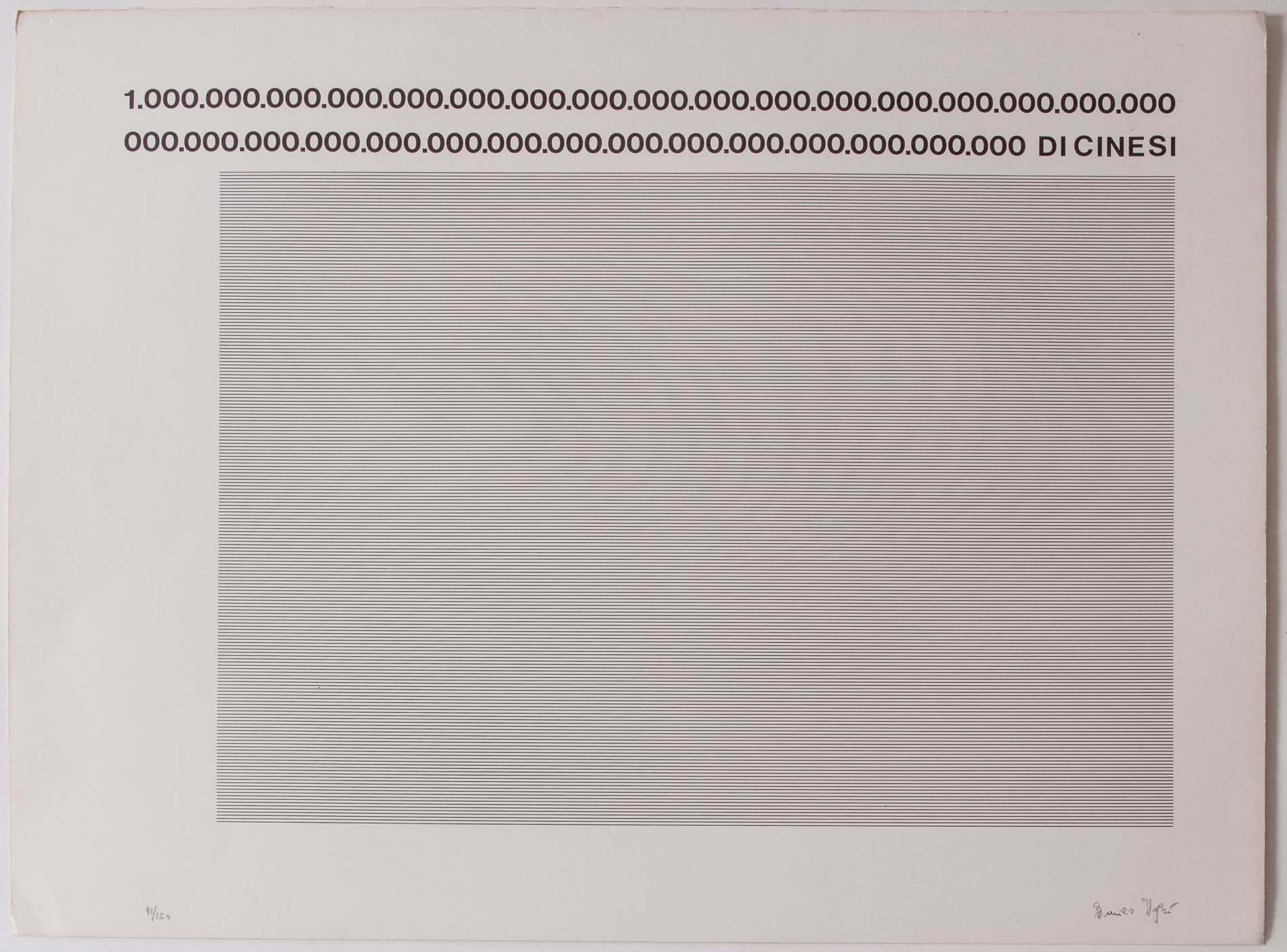 Emilio Isgrò (Barcellona di Sicilia 1937), “1.000… di Cinesi”, 1937. - Litografia su carta, firmata in basso a destra Emilio Isgrò, numero di tiratura in basso a sinistra 91/150, Foglio H cm 62.5x80