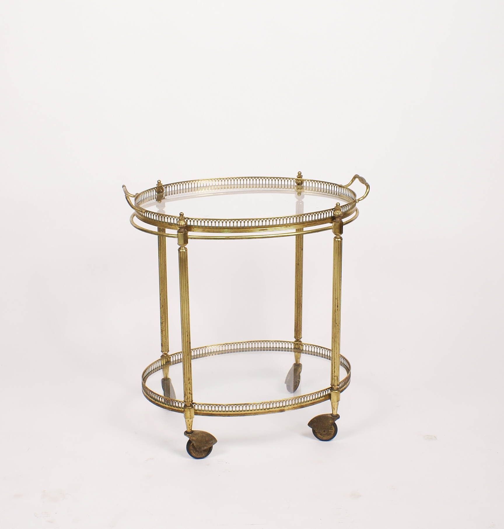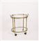 CARRELLO PORTAVIVANDE vecchia manifattura in metallo dorato a due ripiani ovali di cui il primo estraibile e a due manici, gambe provviste di rotelle 60x56x37 cm.