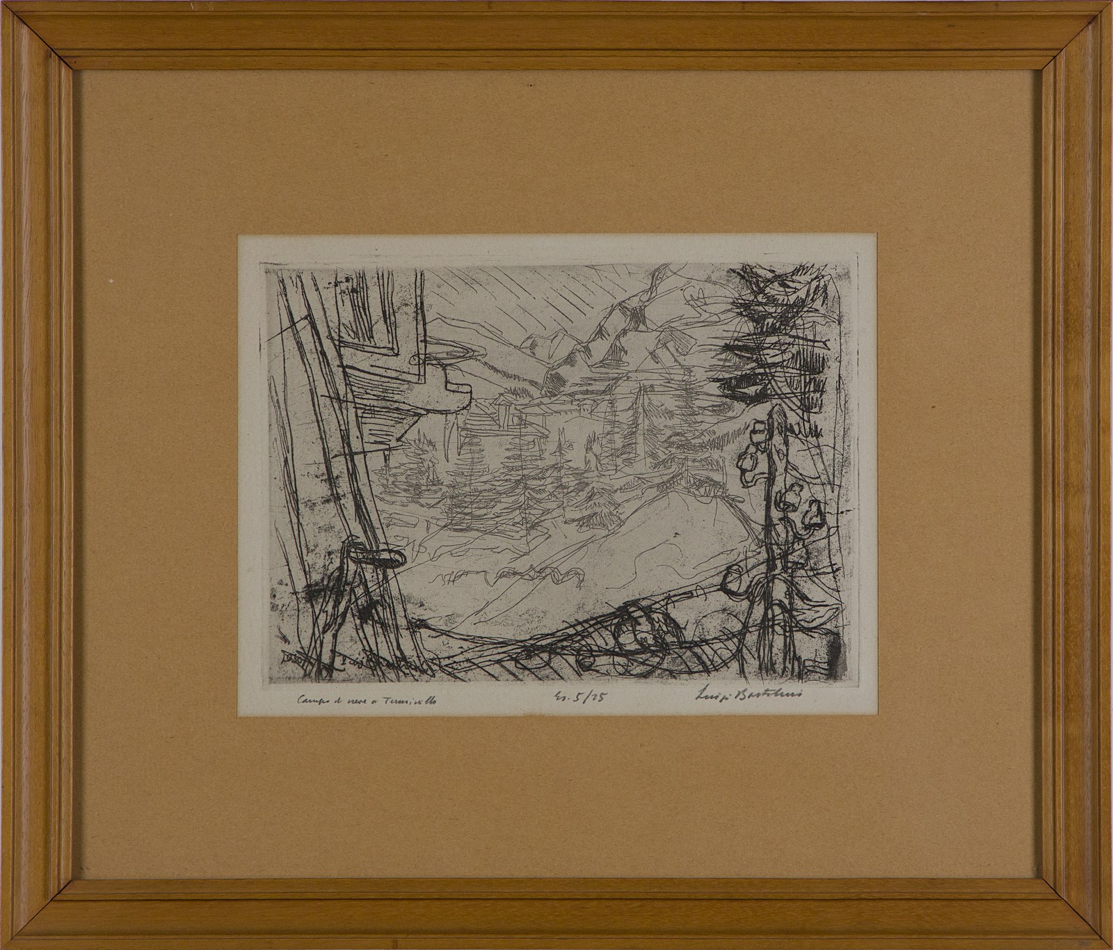 BARTOLINI LUIGI (1892 - 1963) Campo di neve. Acquaforte. Cm 26,00 x 20,00. 5/25, Titolo, tiratura e firma in basso a matita. Dimensione lastra: 17.2x24.6 cm. Difetti. Cornice presente