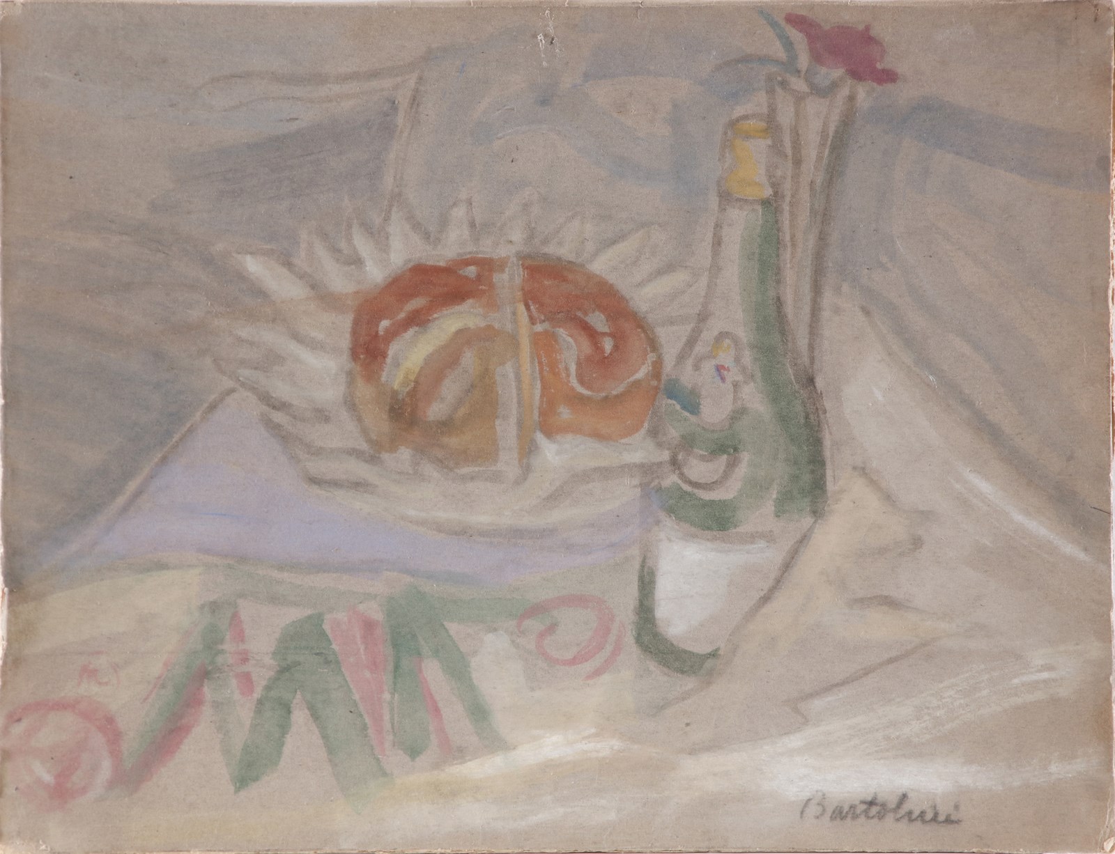 BARTOLINI LUIGI (1892 - 1963) Natura morta con bottiglia. Acquarello su carta. Cm 48,00 x 37,00. Firma in basso a destra. Al retro cartiglio descrittivo della XXXI Biennale, Venezia e cartiglio della XXX Biennale, Venezia. Difetti.