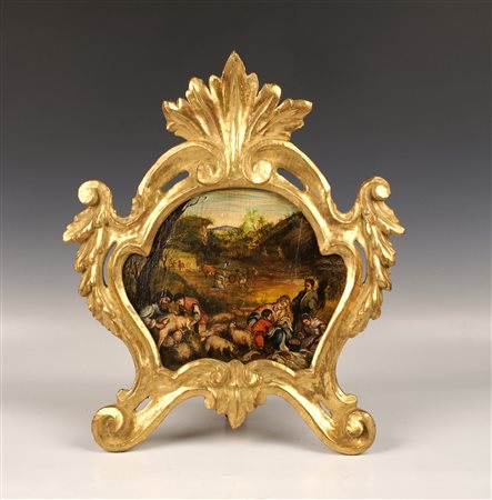 CORNICE DA TAVOLO IN LEGNO DORATO vecchia manifattura con decorazione dipinta su tavola 46x39 cm.