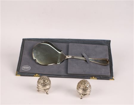 LOTTO IN ARGENTO manifattura italiana composto da una coppia di salierine e una posata da portata 207 gr.