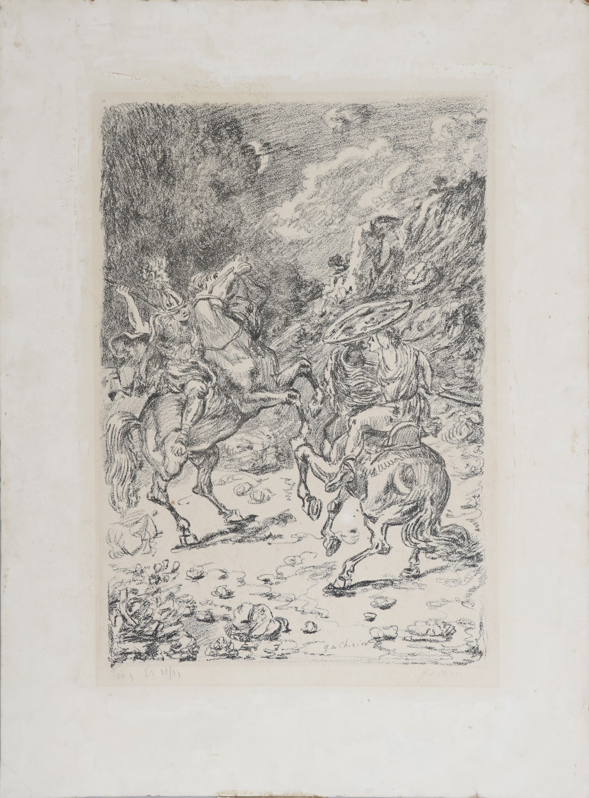 DE CHIRICO GIORGIO (1888 - 1978) I Nictomachi. 1948. Litografia. Cm 48,00 x 65,00. 28/94. Tav.4. Firma e tiratura in basso a matita. Firma in lastra in basso al centro. Dimensione lastra: 45.7x31.1 cm. L'opera fa parte della cartella "I cavalli" edita a Roma dall'editore Carlo Bestetti. Edizione totale: 94 esemplari numerati da 1 a 94; XV esemplari numerati da I a XV su carta delle Cartiere Miliani di Fabriano. Pubblicazione: Ciranna A., Giorgio de Chirico, Catalogo delle opere grafiche [incisioni e litografie] 1921-1969, Milano-Roma, 1969, #116. Giorgio de Chirico, Catalogo dell'opera grafica 1921-1969, Edizioni Bora, Bologna, 1996, #128. Difetti.