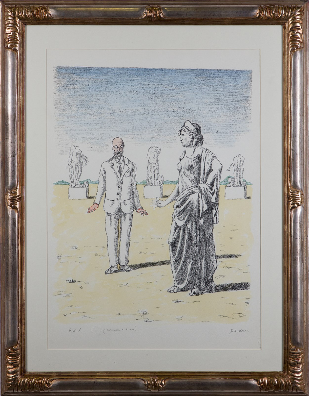 DE CHIRICO GIORGIO (1888 - 1978) Il filosofo e la musa. 1971. Litografia colorata a mano. Cm 53,00 x 70,50. P.d.a. Tiratura e firma a matita in basso. Timbro a secco Giorgio De Chirico in basso a sinistra e timbro a secco Alberto Caprini Stampatore, Roma, in basso a destra. Certificato di autenticità Telemarket, Roncadelle. Edizione totale: 120 esemplari numerati da 1/120 a 120/120; 25 esemplari numerati da I/XXV a XXV/XXV; 21 esemplari siglati con le lettere da A a Z; 12 prove d'artista + 8 colorate a mano dall'artista. Pubblicazioni: Bolaffi, n.9, Torino, 1979; L. Piccioni - A Jouffroy, Messina, 1980; W, Schmied, Aosta, 1981; Bristol/Oxford/Sheffield/Londra, 1985; M. Fagiolo - G. Della Chioesa, Ferrara, 1985; D. Guzzi - R.Dottori, Colonnella, 1998; Giorgio De Chirico - Catalogo dell'opera grafica, 1969 - 1977, a cura di Edoardo Brandani, Edizioni Bora, Bologna, 1990, pag. 154, tav.131. . Cornice presente