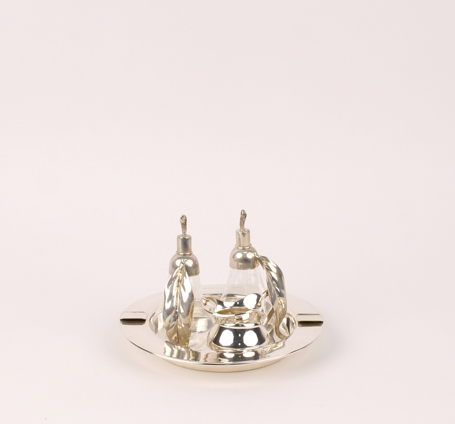 LOTTO IN ARGENTO manifatture italiane composto da un posacenere, una piccola lattiera e due ampolle in vetro e argento 200 gr.