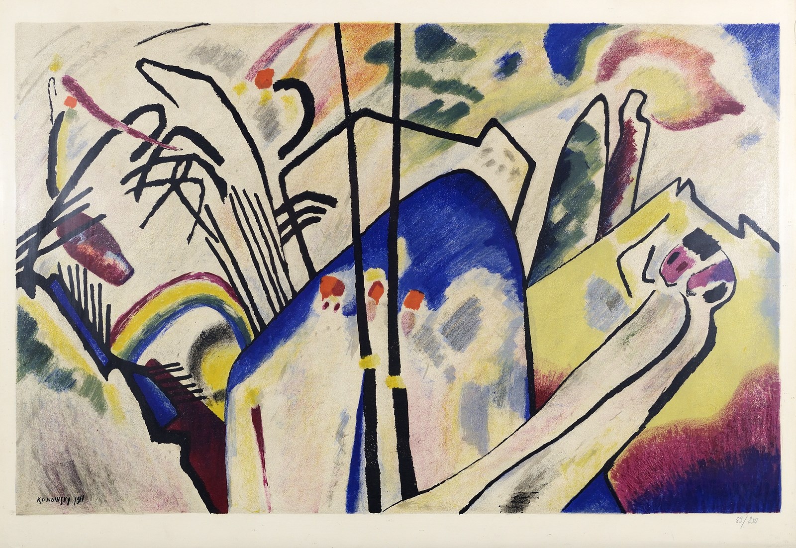 KANDINSKY WASSILY (1866 - 1944) Senza titolo. 1911. stampa litografica. Cm 57,00 x 38,50. 83/250. Firma e anno a stampa in basso a sinistra. Tiratura a matita in basso a destra. Timbro a secco Maeght Editeur, Paris in basso a sinistra. Carta Rives. Cornice presente