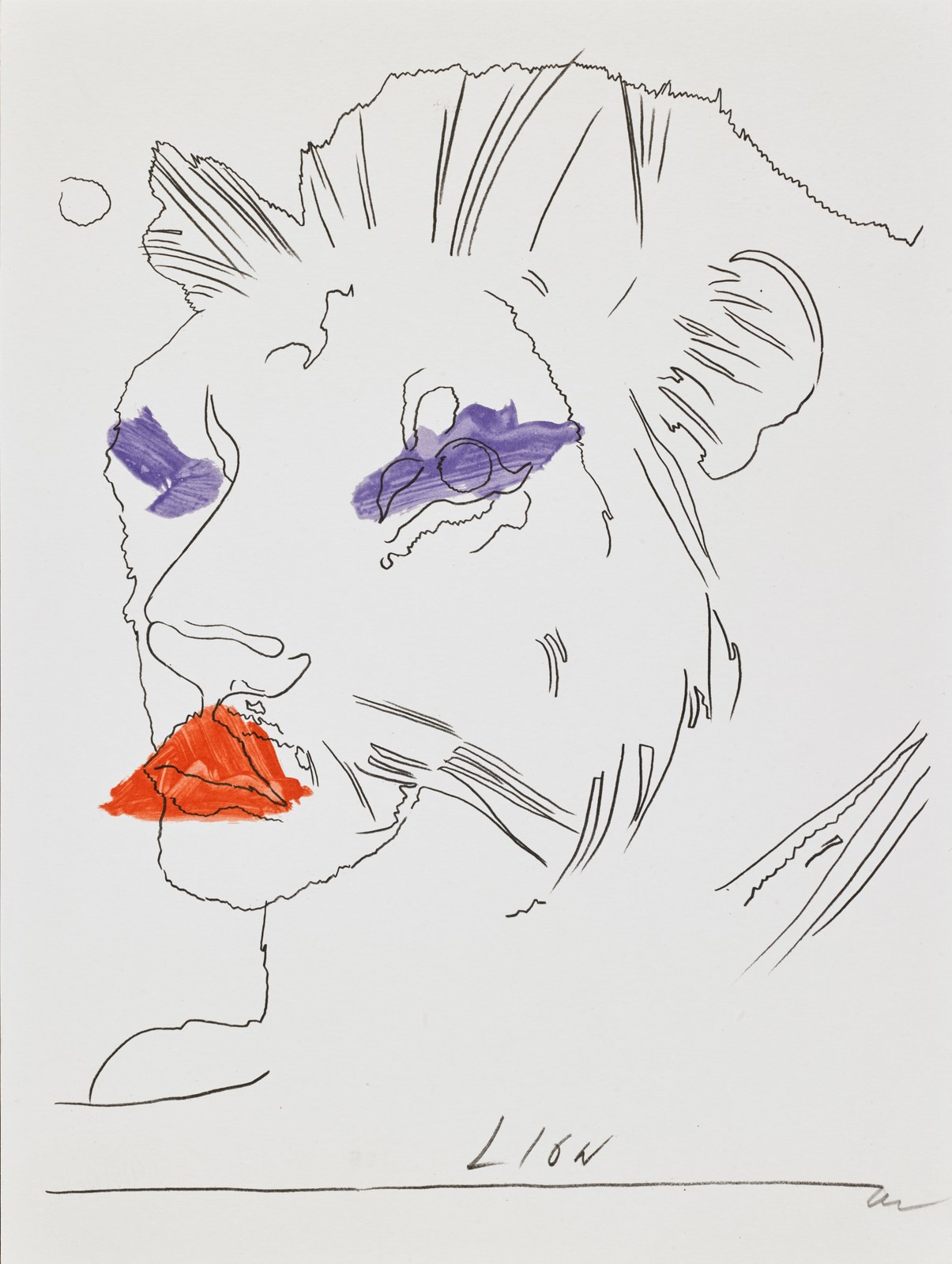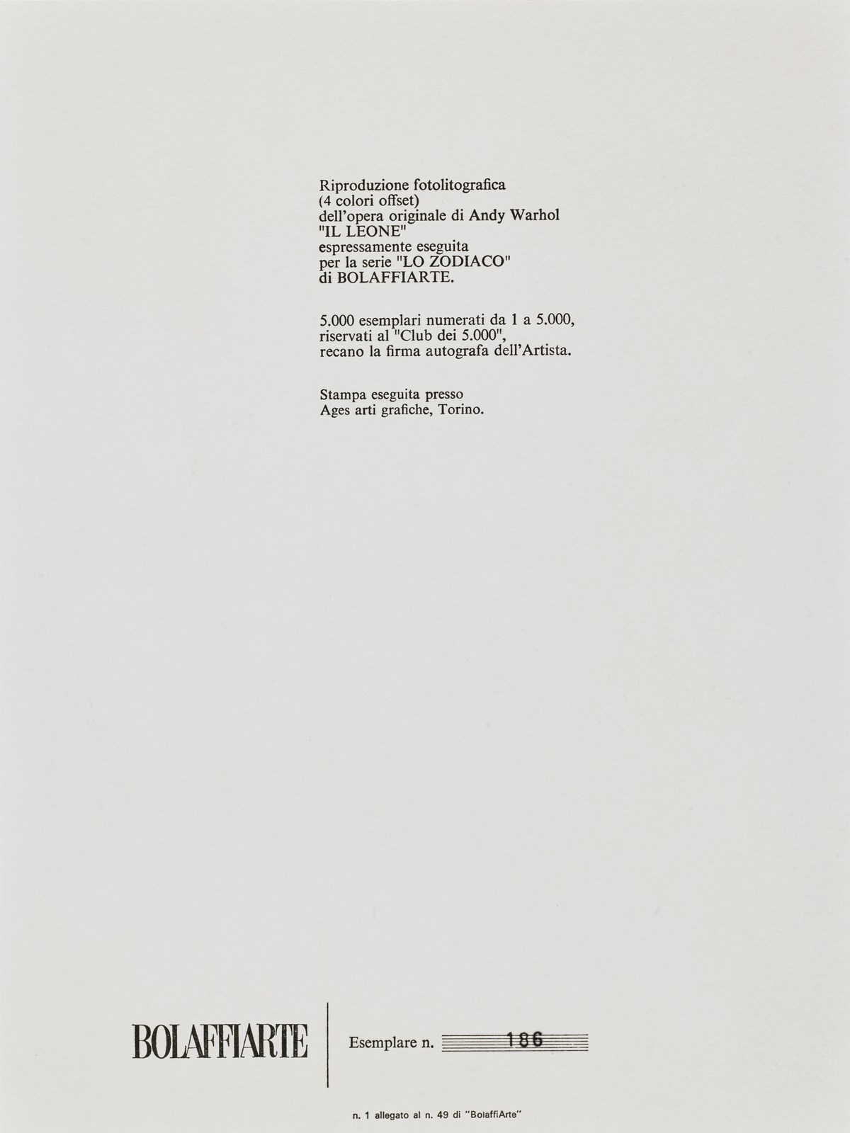 WARHOL ANDY (1928 - 1987) Dalla Serie Lo Zodiaco. Il leone. Stampa Offset. Cm 21,00 x 28,00. Es n.186. Timbro a secco Bolaffi Arte in basso a sinistra. Edizione Totale: 5000 esemplari numerati da 1 a 5000 riservato al Club dei 5000. Stampatore: Ages Arti, Torino. Firma a matita in basso a destra.