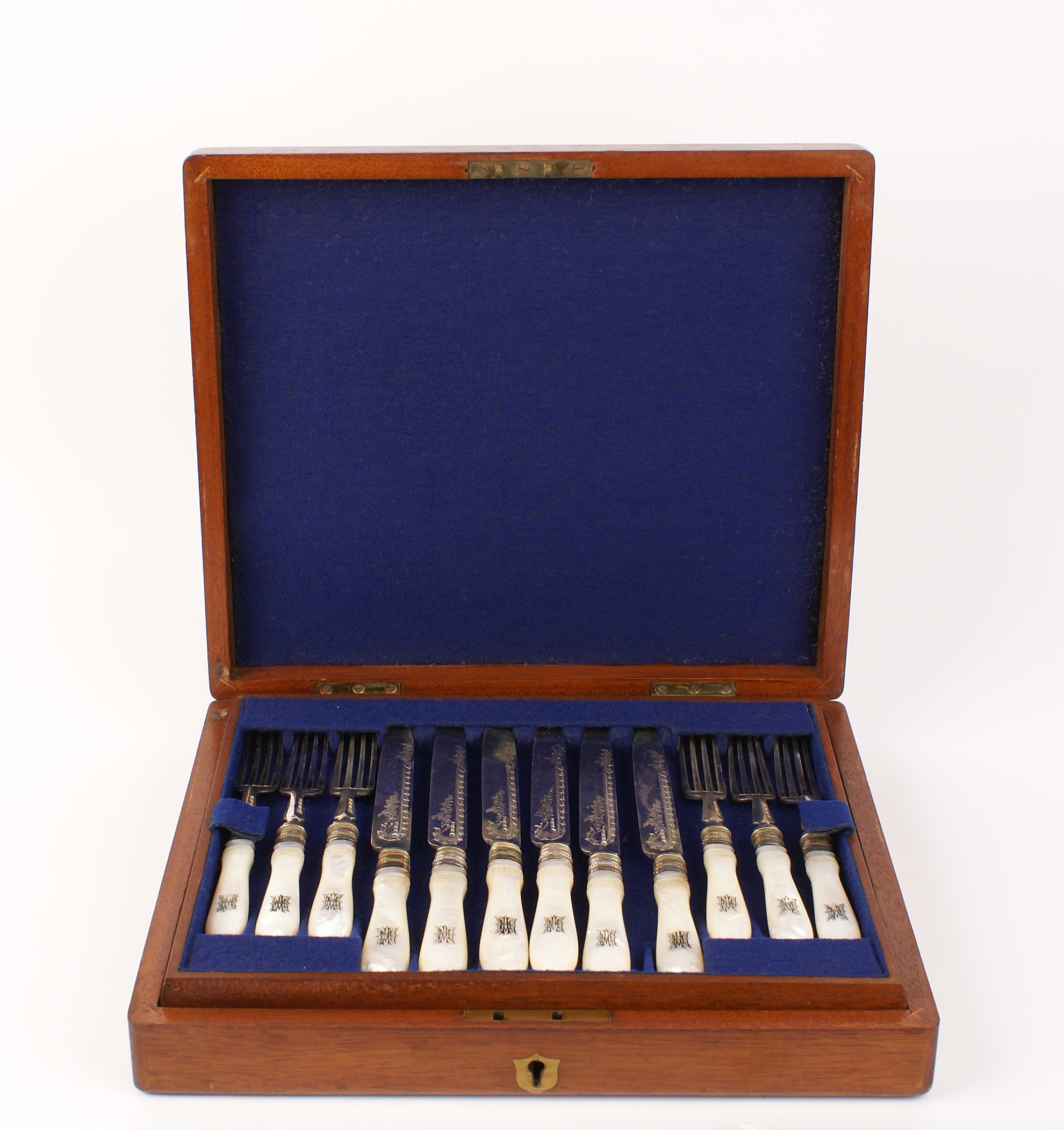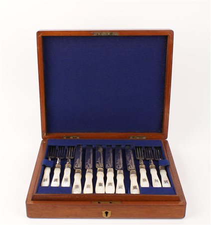 SERVIZIO DI 24 POSATE DA DESSERT IN SHEFFIELD Inghilterra 1880 circa con manici in madreperla composto da 12 forchette e 12 coltelli, entro astuccio in legno di mogano