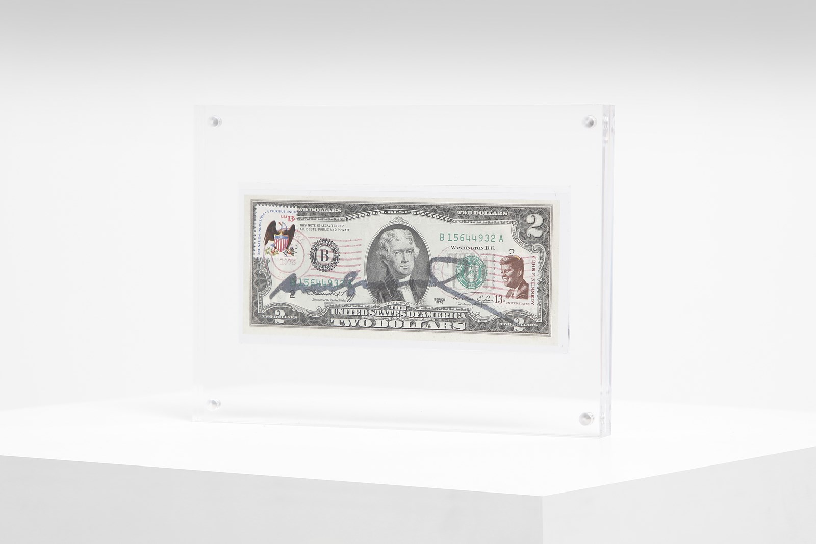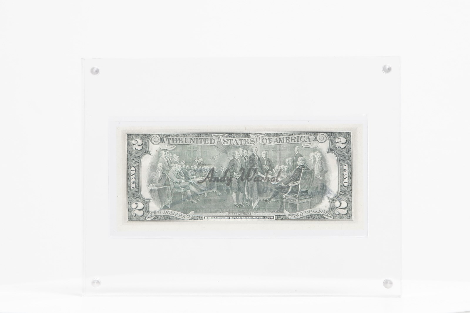 WARHOL ANDY (1928 - 1987) Two dollars. Intervento su banconota. Cm 16,00 x 7,00. Firma a pennarello. Cornice presente
