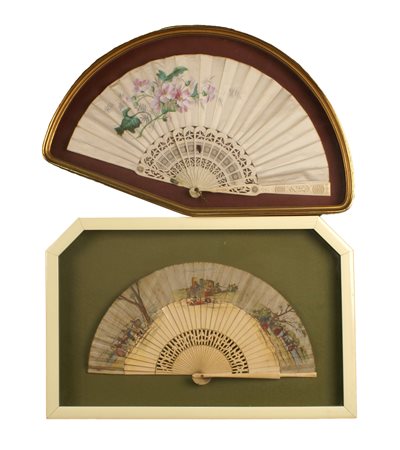 DUE ANTICHI VENTAGLI in avorio e seta dipinta in policromia entro cornici
