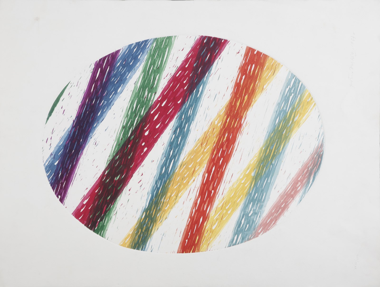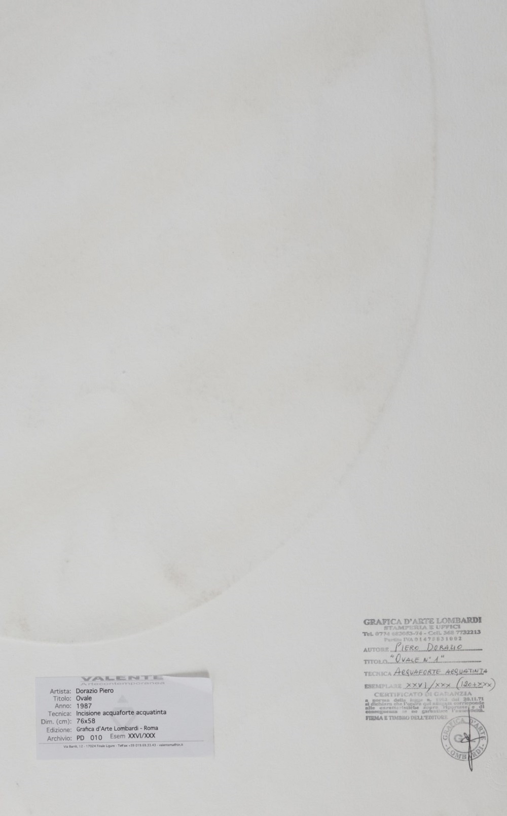 DORAZIO PIERO (1927 - 2005) Ovale. 1987. Acquaforte e acquatinta. Cm 58,00 x 76,00. Dimensioni lastra: 57x44 cm. Editore Valente Arte Contemporanea, Finale Ligure. Stampatore: Grafica d'arte Lombardi, Roma. Al retro cartiglio descrittivo Valente Arte, Finale Ligure; Timbro e timbro a secco grafica d'arte Lombardi, Roma.