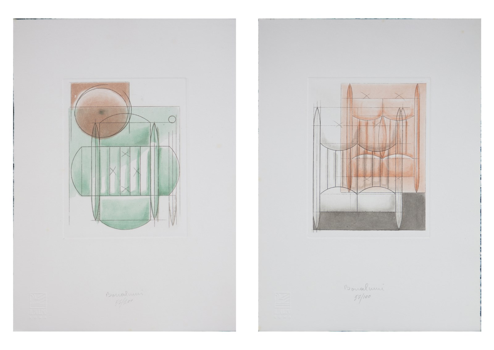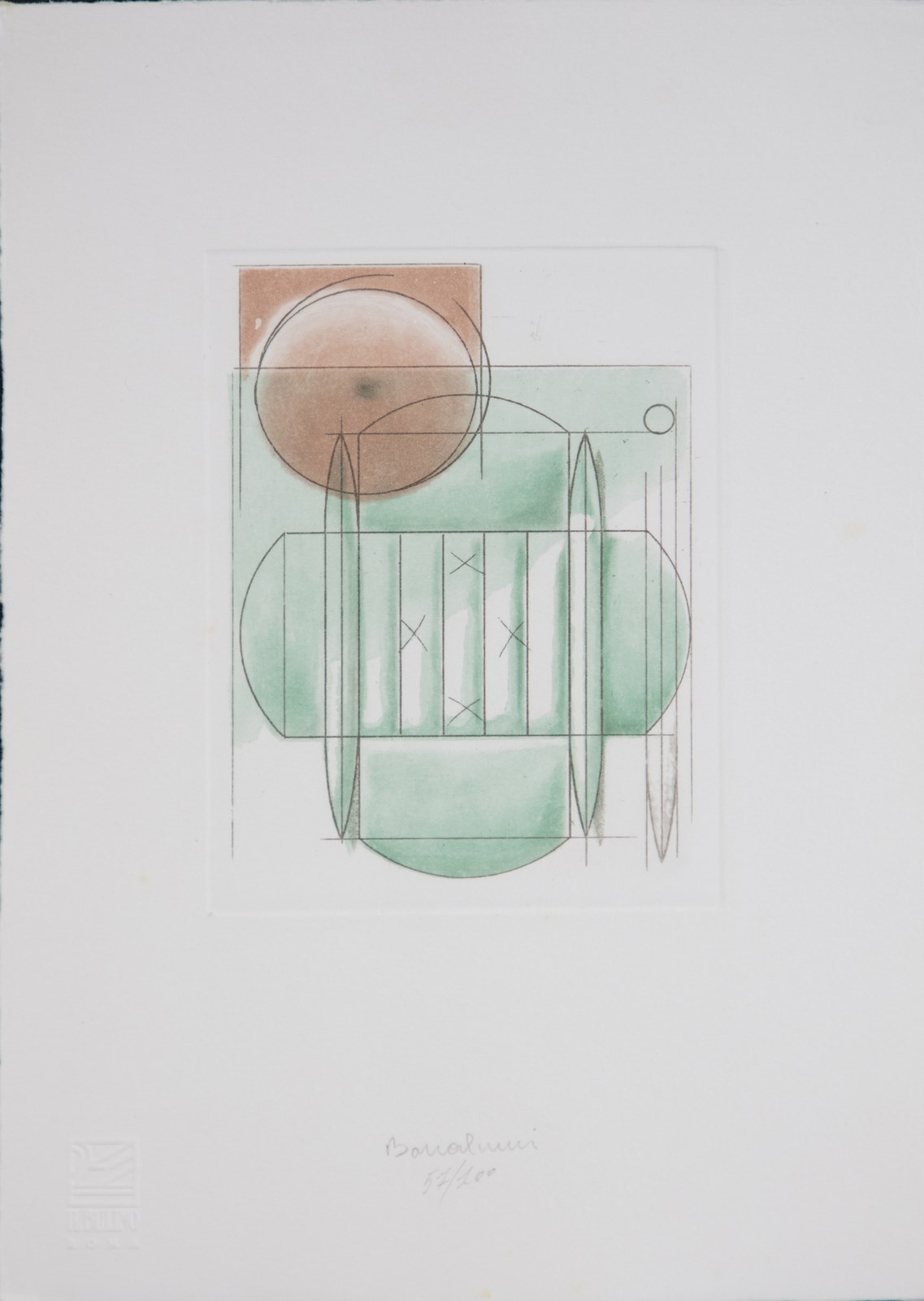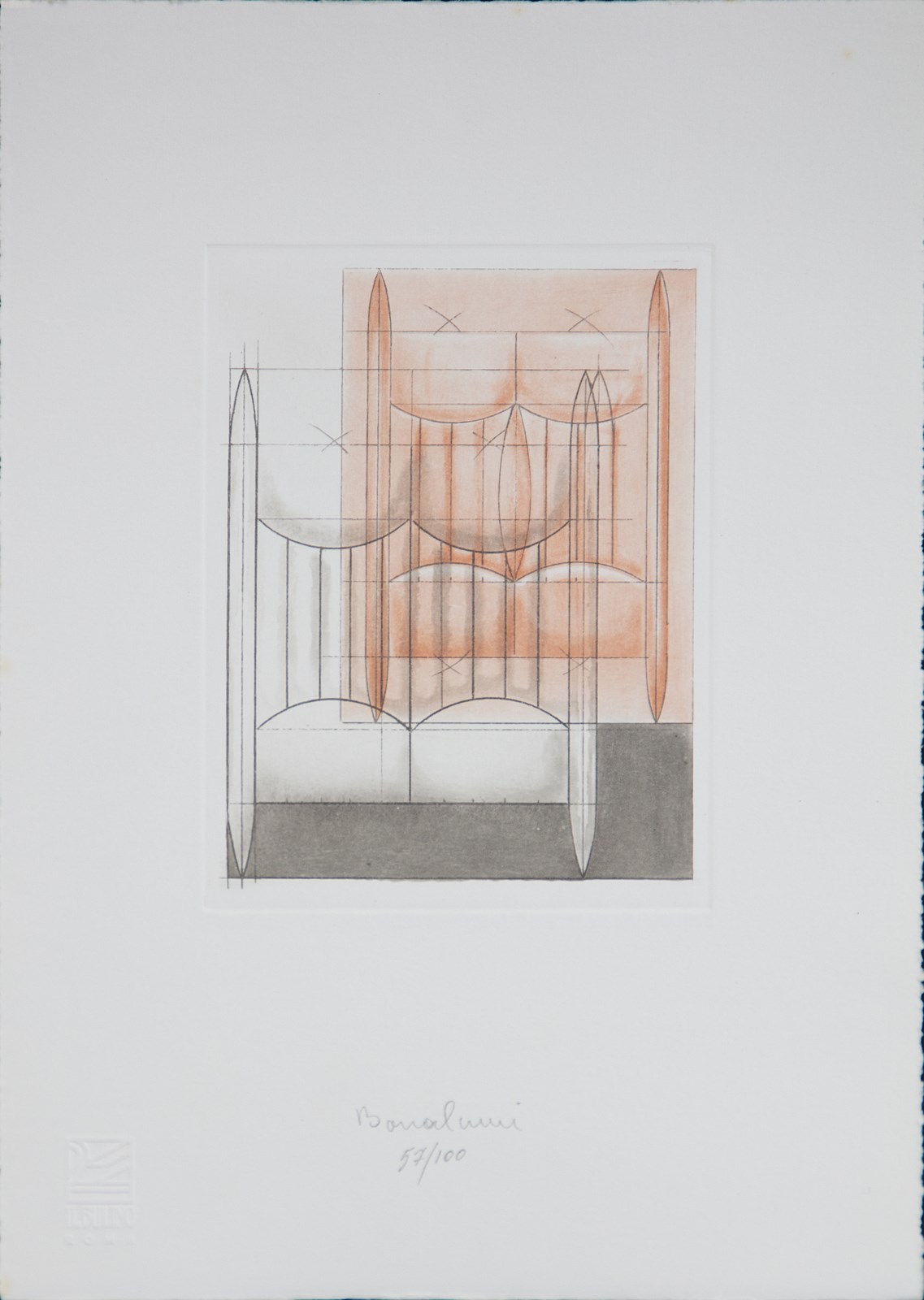 BONALUMI AGOSTINO (1935 - 2013) Senza titolo. Acquaforte e acquatinta. Cm 17,50 x 25,00. 57/100. Ogni foglio presenta tiratura e firma in basso a matita. Timbro a secco Il Bulino, Roma, in basso a sinistra. Il volume Arrondissement la vie di Roberto Senesi, con due incisioni di Agostino Bonalumi, è stato tirati in centoventi copie numerate e firmate di cui: 100 numeri arabi, XX numeri romani. Dimensione lastra: 13x9.5 cm. Stampatore: Sergio Pandolfini. Carta Graphia della carteria Sicars. Editore: Il Bulino, Roma. Confezione originale.