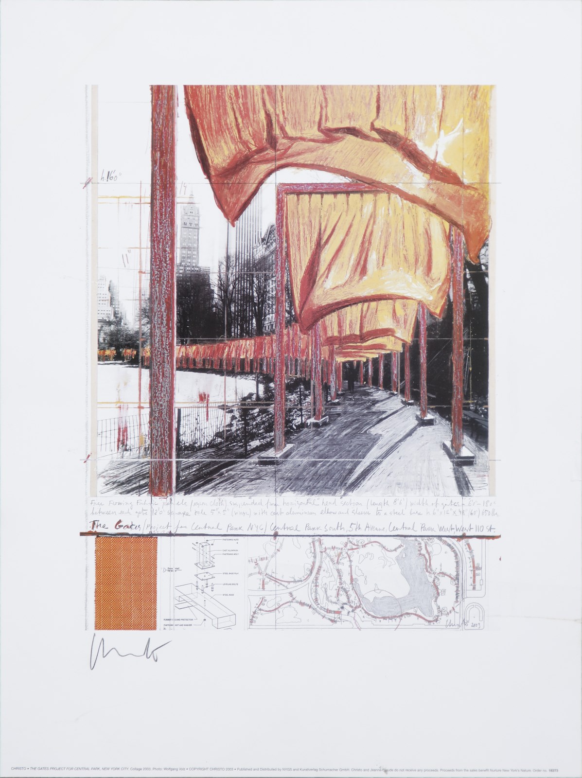 CHRISTO' (n. 1935) & JEANNE-CLAUDE (1935 - 2009) The Gates, project for the Central Park, New York. Poster. Cm 30,00 x 40,00. Firma a matita in basso a sinistra.