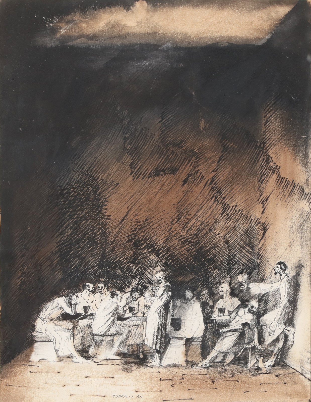 ZUPPELLI MASSIMO (n. 1939) Ultima cena. . 1966. Inchiostro su carta. Cm 24,00 x 30,50. Firma e anno in basso al centro.
