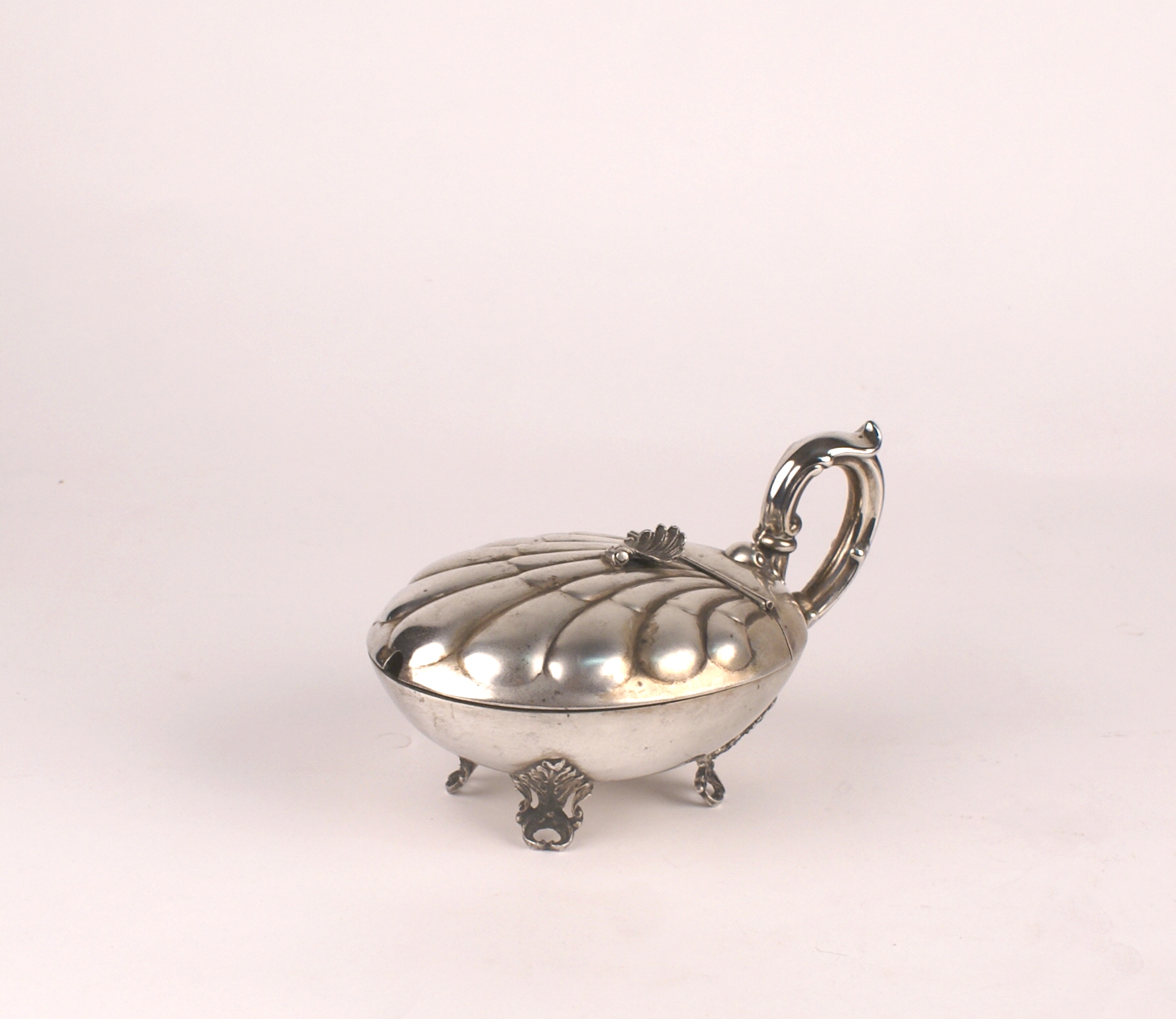 FORMAGGIERA IN ARGENTO italia vecchia manifattura a motivo di conchiglia con manico e piedini a voluta, interno in vetro, cm. 11x18 300 gr.