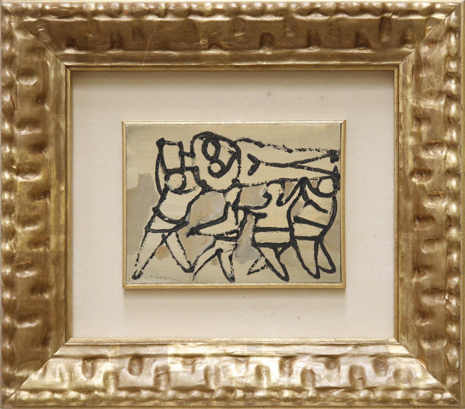 MACCARI MINO (1898 - 1989) Senza titolo. Tecnica mista su cartone telato. Cm 24,00 x 18,00. Firma in basso a sinistra. Autentica dell'artista su fotografia. Opera archiviata presso l'Archivio Mino Maccari, Cinquale, come da documentazione fotografica allegata all'opera riportante il relativo numero d'inventario. Anni '70. Cornice presente