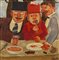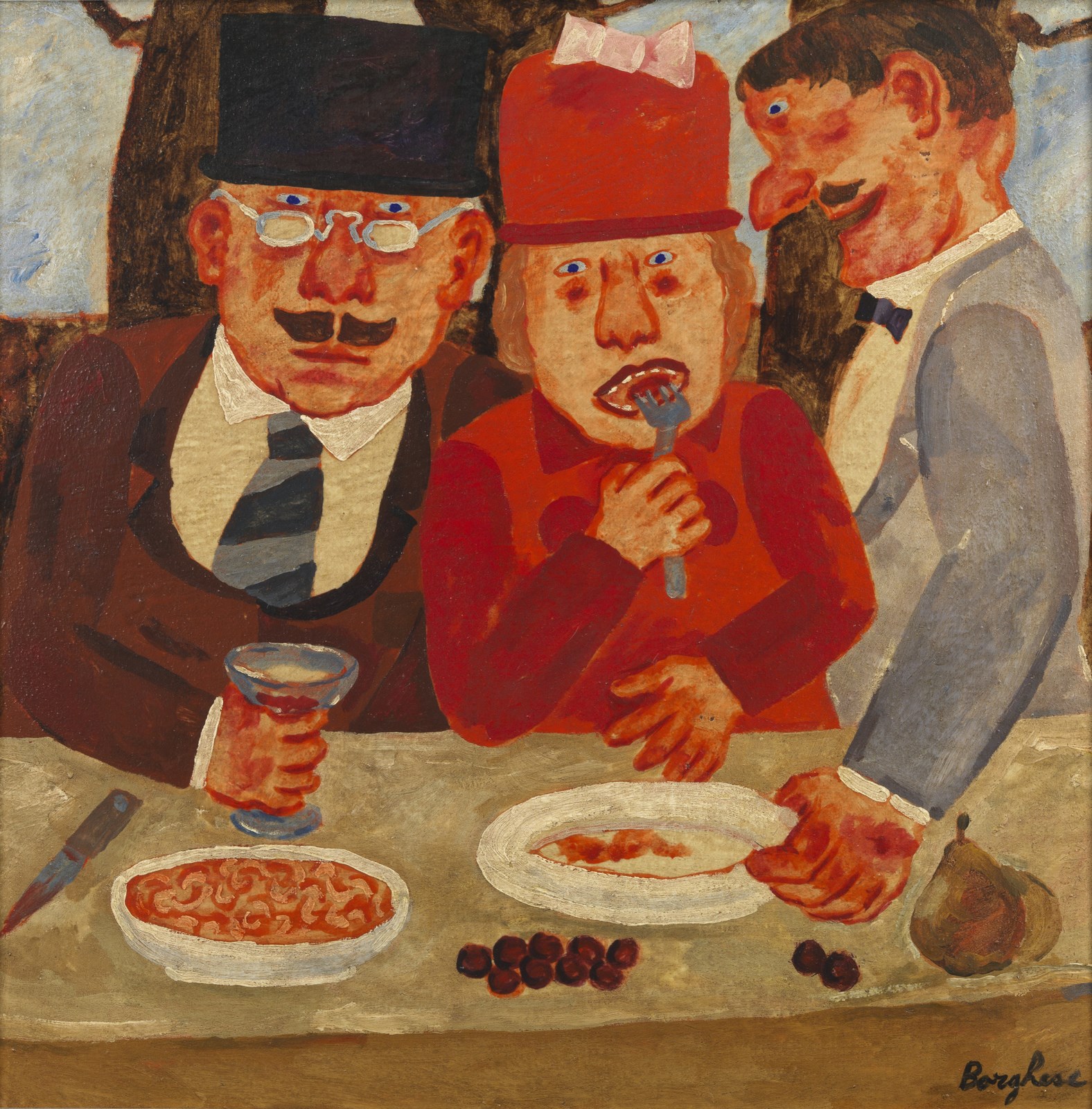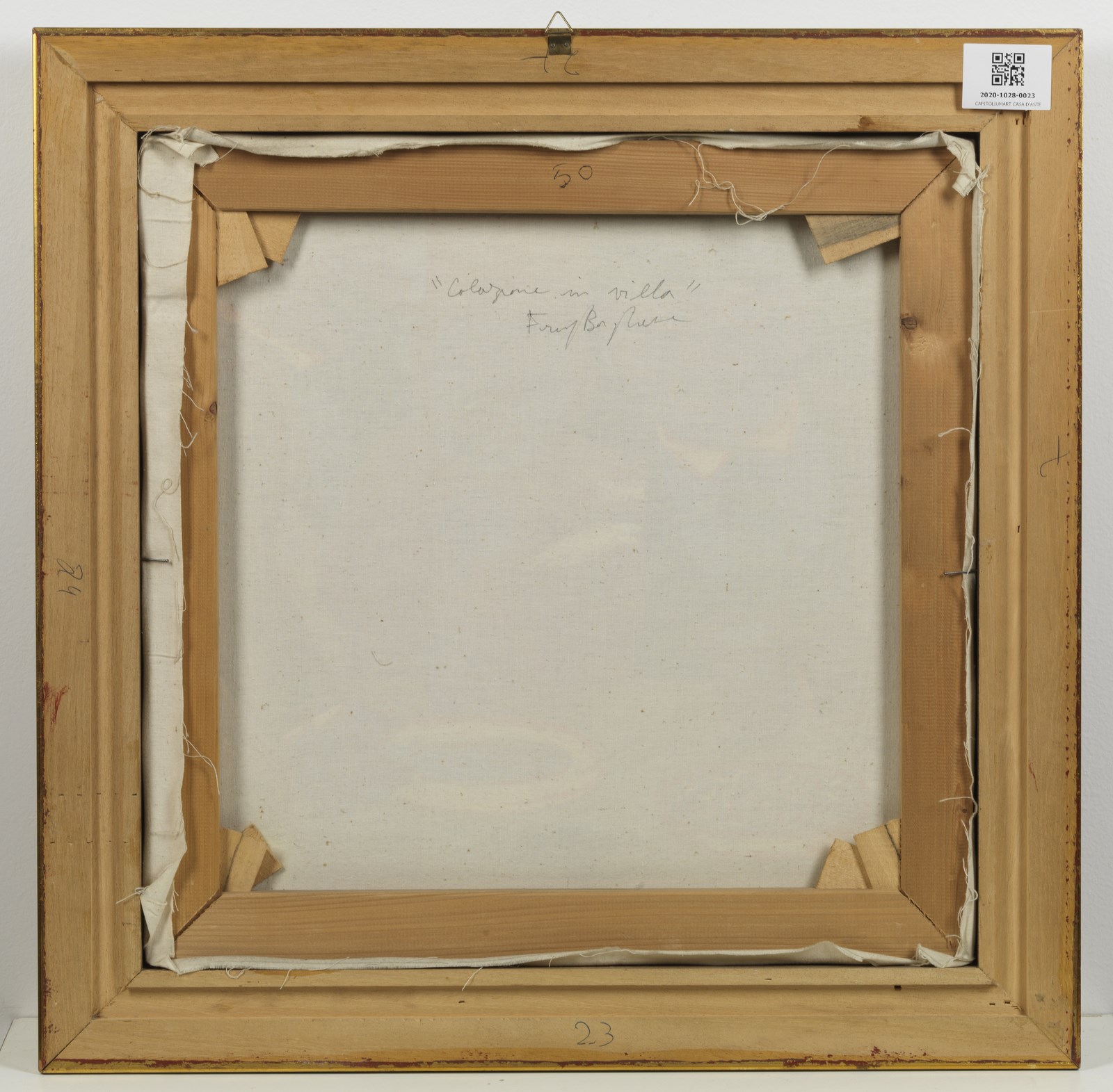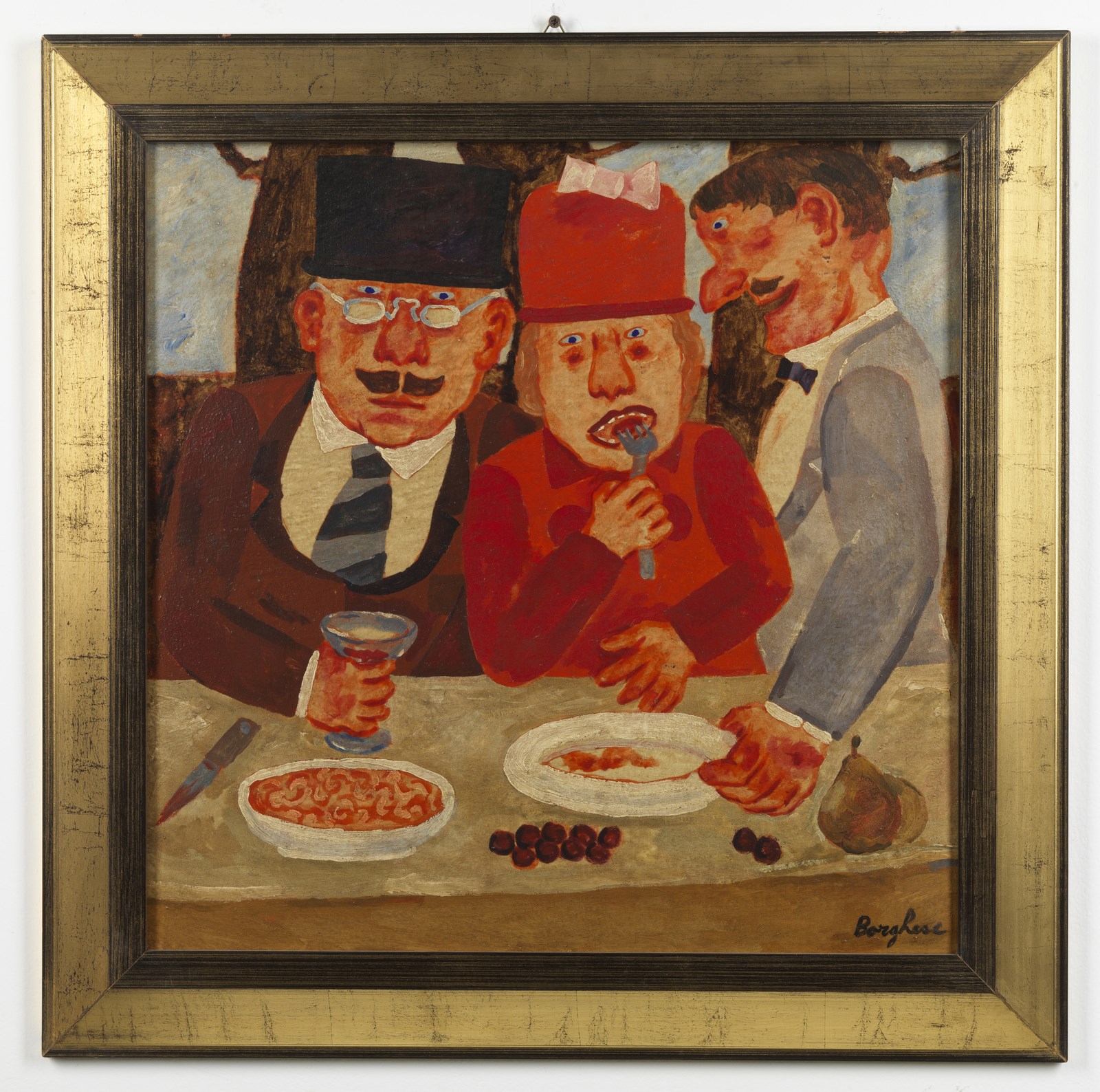 BORGHESE FRANZ (1941 - 2005) Colazione in villa. Olio su tela . Cm 50,00 x 50,00. Firma in basso a destra. Al retro titolo e firma. Opera archiviata presso lo Studio Franz Borghese, Milano, come da documentazione fotografica allegata all'opera riportante il relativo numero d'inventario. Cornice presente