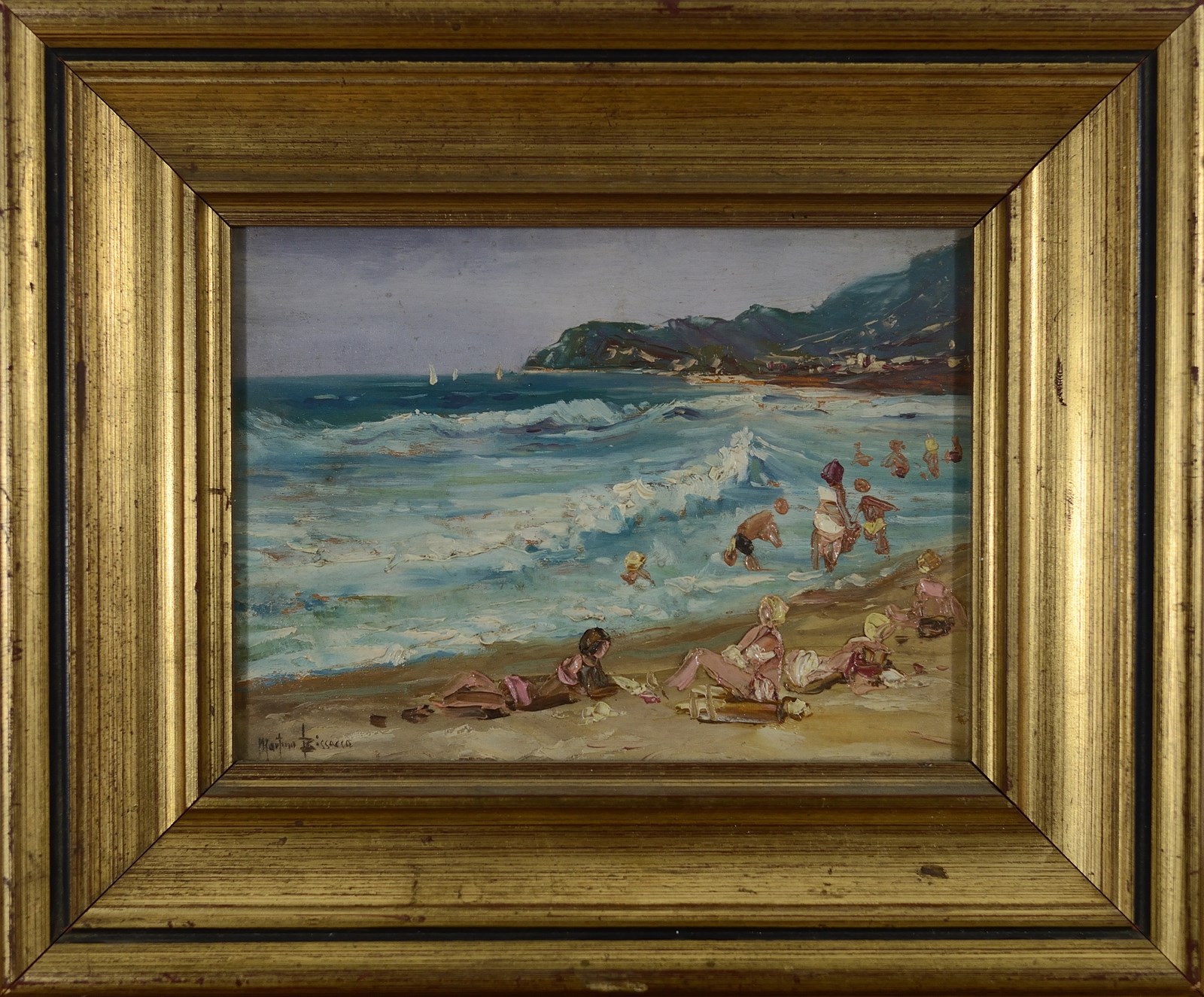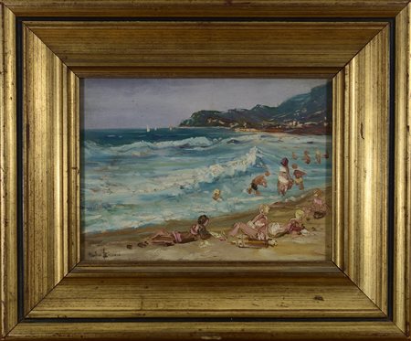 BISSACCO MARTINO (n. 1941) Sulla spiaggia. Olio su tavola. Cm 24,00 x 18,00. Firmato in basso a sinistra. Al retro Firma e titolo. Cornice presente